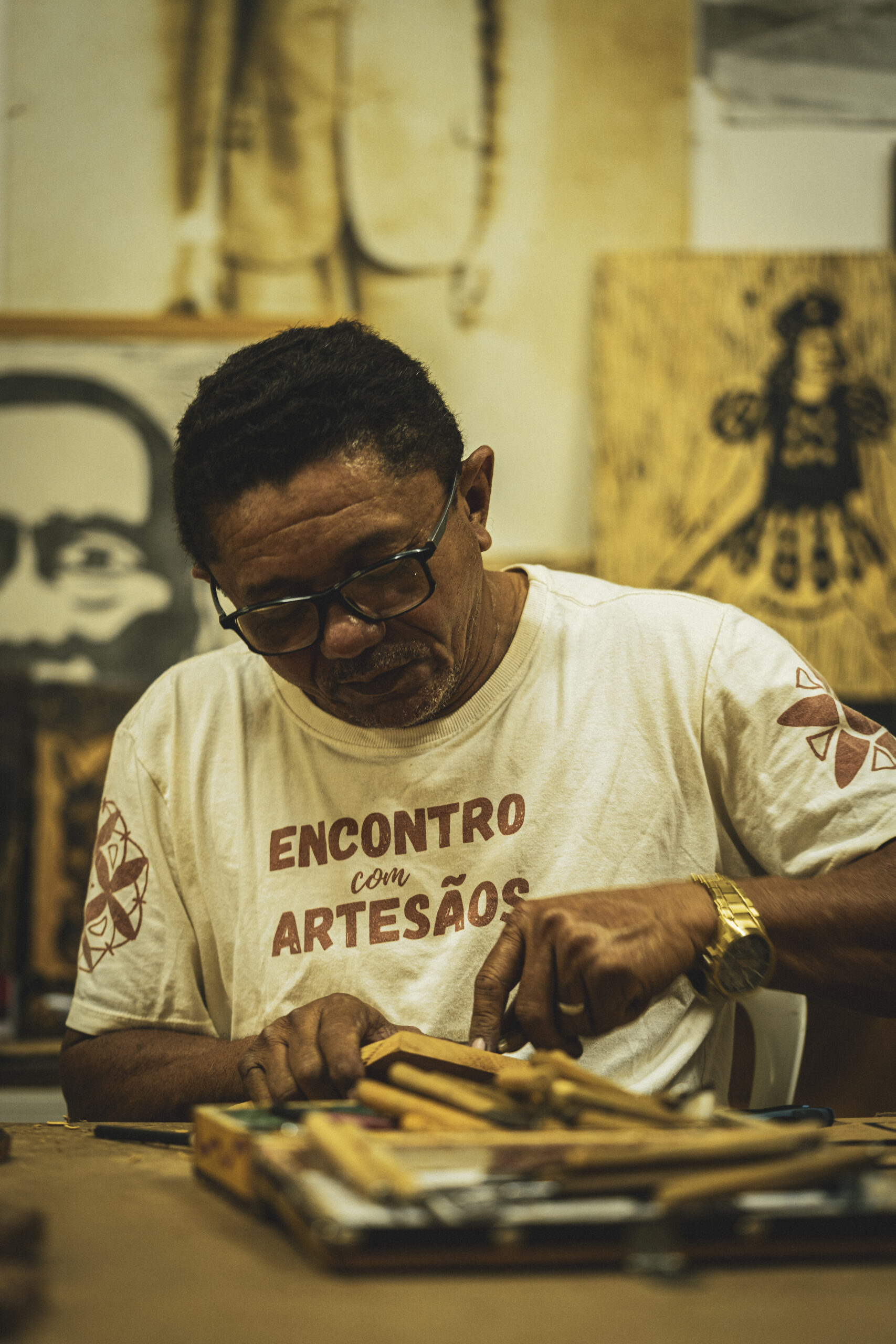 Anos depois, em 1989, já como agente administrativo da Prefeitura de Juazeiro, reencontrou os cordéis de Abraão Batista e se reconheceu neles. Também se aproximou das lendas do Rio Grande do Norte, reunidas por Câmara Cascudo, e decidiu se dedicar à xilogravura. “Em 1968 eu nasci, em 1989 eu me identifiquei [com a arte]”, afirma. Foram dez anos de aprofundamento até realizar, em 1999, sua primeira exposição no BNB Cultural: Obras de Misericórdia, com 14 peças. Desde então, são 35 anos vivendo exclusivamente da arte. Casou-se aos 24 anos e um de seus filhos seguiu o mesmo caminho, herdando o ofício.