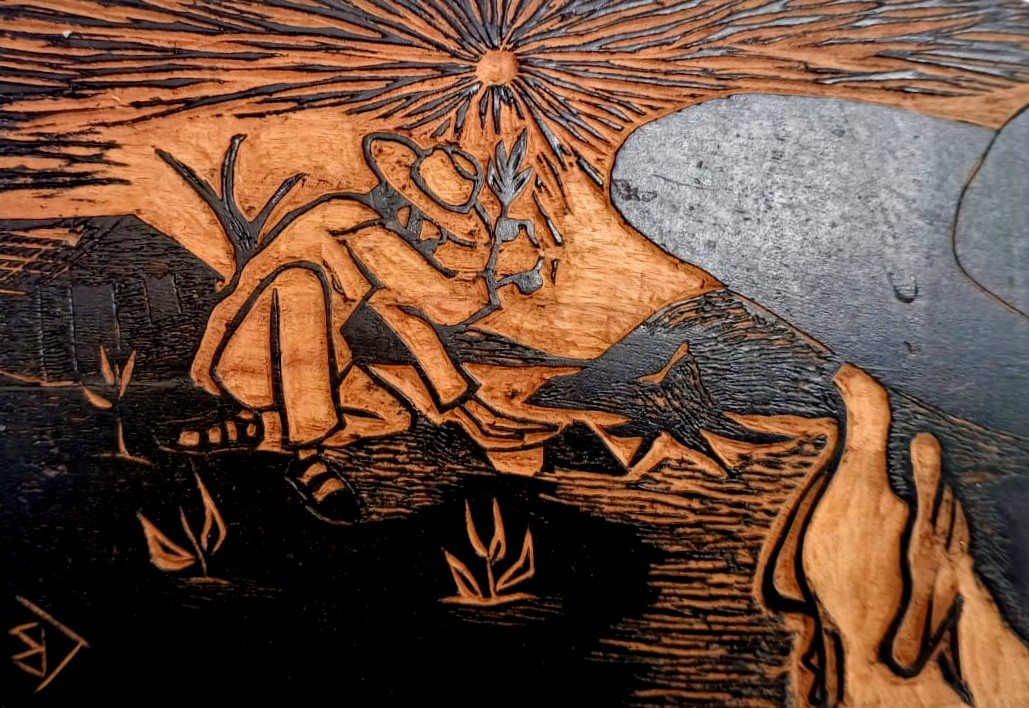 Não se pode narrar a trajetória de Cosmo sem evocar seu território. Natural de Juazeiro do Norte, cresceu imerso na atmosfera efervescente de uma cidade moldada pela arte e pela fé, sob a sombra mítica de Padre Cícero. Ao responder sobre como começou sua relação com a xilogravura, o artista conta que desenha desde a infância. Foi ainda na escola que teve contato com as obras do mestre Abraão Batista — um entre os muitos xilógrafos e multiartistas da região. O cordel o capturou por sua potência imagética e narrativa. Cosmo fala com entusiasmo sobre a tríade que compõe essa arte: xilógrafo, poeta e leitor — “a capa fala do miolo”, diz.