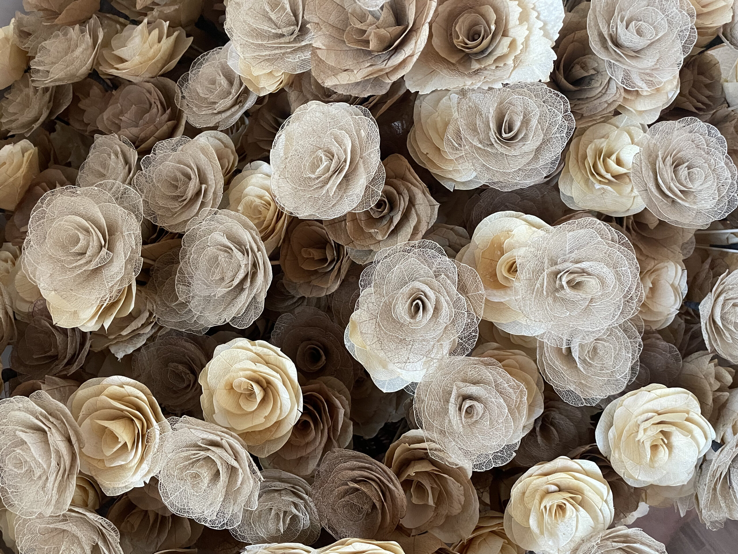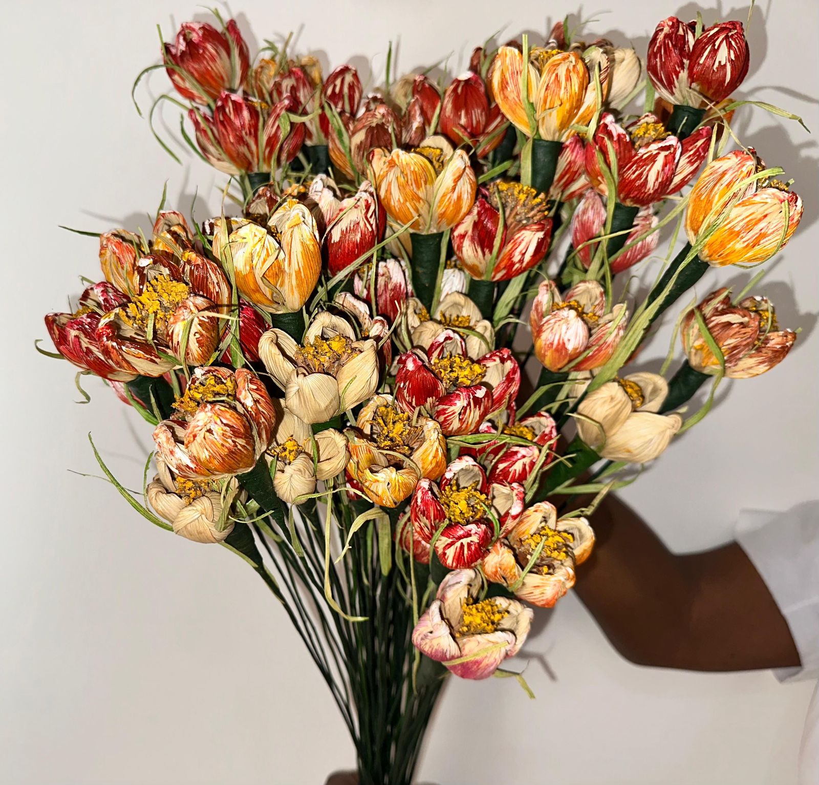 O processo das peças de Dina é muito minucioso e reafirma seu compromisso com a sustentabilidade, reaproveitando a palha que seria descartada, buscando o material com vendedores de milho. Após a coleta, a palha de milho é levada ao ateliê, onde passa por um longo processo de seleção, higienização e preparação. Para o miolo das flores, a textura de estigma é conseguida com a colagem de areia de praia, coletada por Dina especificamente nas praias com a textura mais adequada, mais grossa. A palha da costa passa por um processo de fiação para ser utilizada na confecção do crochê, feito com agulhas próprias, finas, e agulhas de costura. Todos os detalhes são pensados — os espelhos de alguns orixás, por exemplo, têm detalhes metálicos colados para dar a ideia de reflexo — um detalhe primoroso que, junto a todo o processo, frequentemente enche as mãos de Dina de calos.
