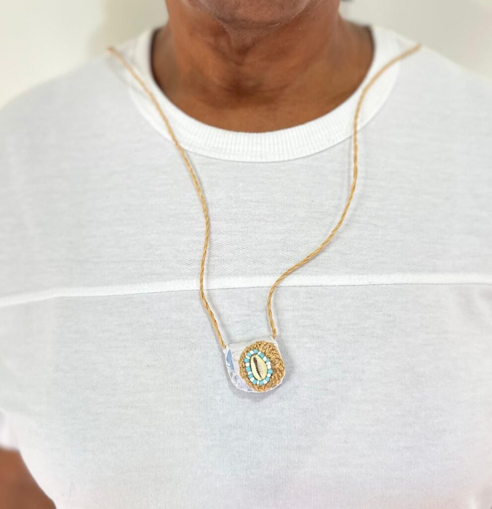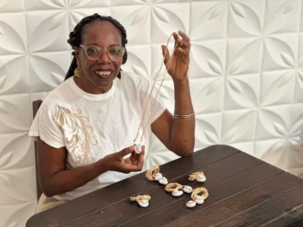 Dinalva Maria Bispo dos Santos, que prefere ser chamada de Dina, é natural de Salvador. Seu artesanato é profundamente marcado pela herança familiar e pela ancestralidade. Para ela, é essencial que seu trabalho dialogue com a cultura nigeriana e com o candomblé de matriz nigeriana. Sua família, tanto do lado paterno quanto do materno, é descendente de nigerianos. Seu bisavô veio diretamente da Nigéria para a Bahia e, junto a outros doze companheiros, fundou o primeiro candomblé em solo baiano. Essa linhagem familiar carrega uma imensa riqueza cultural, mas também os efeitos persistentes da colonização.