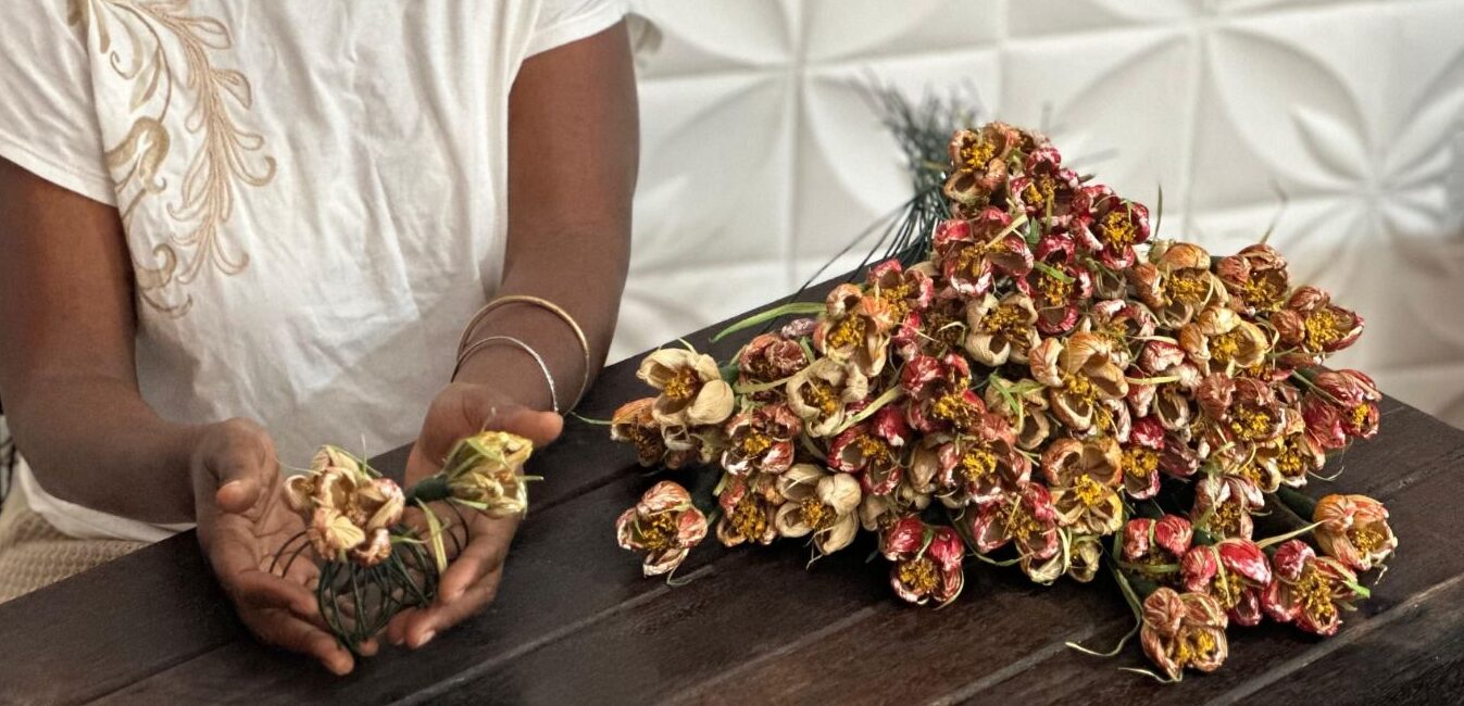 Estatuetas de orixás, patuás, escapulários e flores fazem parte do universo de Dina, que assina seu trabalho como Majeko — “plantação de milho” ou “milharal” em iorubá. Um nome que funciona como metonímia de sua trajetória e do saber-fazer ancestral.