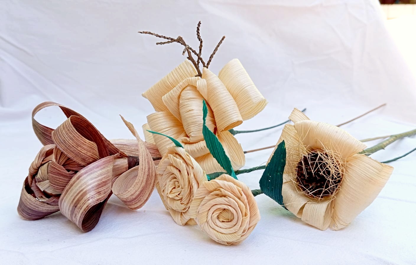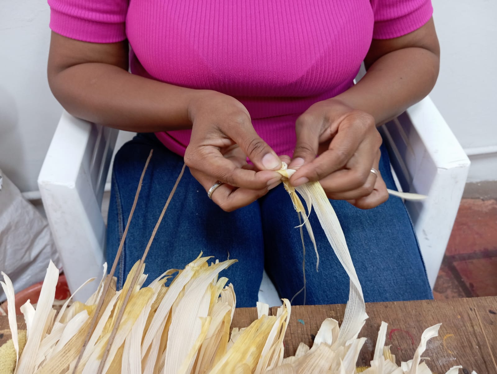 A matéria-prima primordial é a palha de milho, coletada diretamente nas plantações. Para que a palha possa ser utilizada no trançado, é necessário deixá-la secar na roça após a colheita do milho. Além disso, é preciso fazer uma seleção cuidadosa da entrepalha. Alguns desafios têm se colocado: a diminuição da plantação de milhos crioulo, as mudanças climáticas e o foco crescente na produtividade têm dificultado o acesso à matéria-prima. Para a produção, são muitas as etapas, a coleta, a seleção, a soltura das fibras, a higienização e a pintura. Esta última é feita, em sua maioria, com pigmentos naturais, com plantas nativas, como o cajueiro.