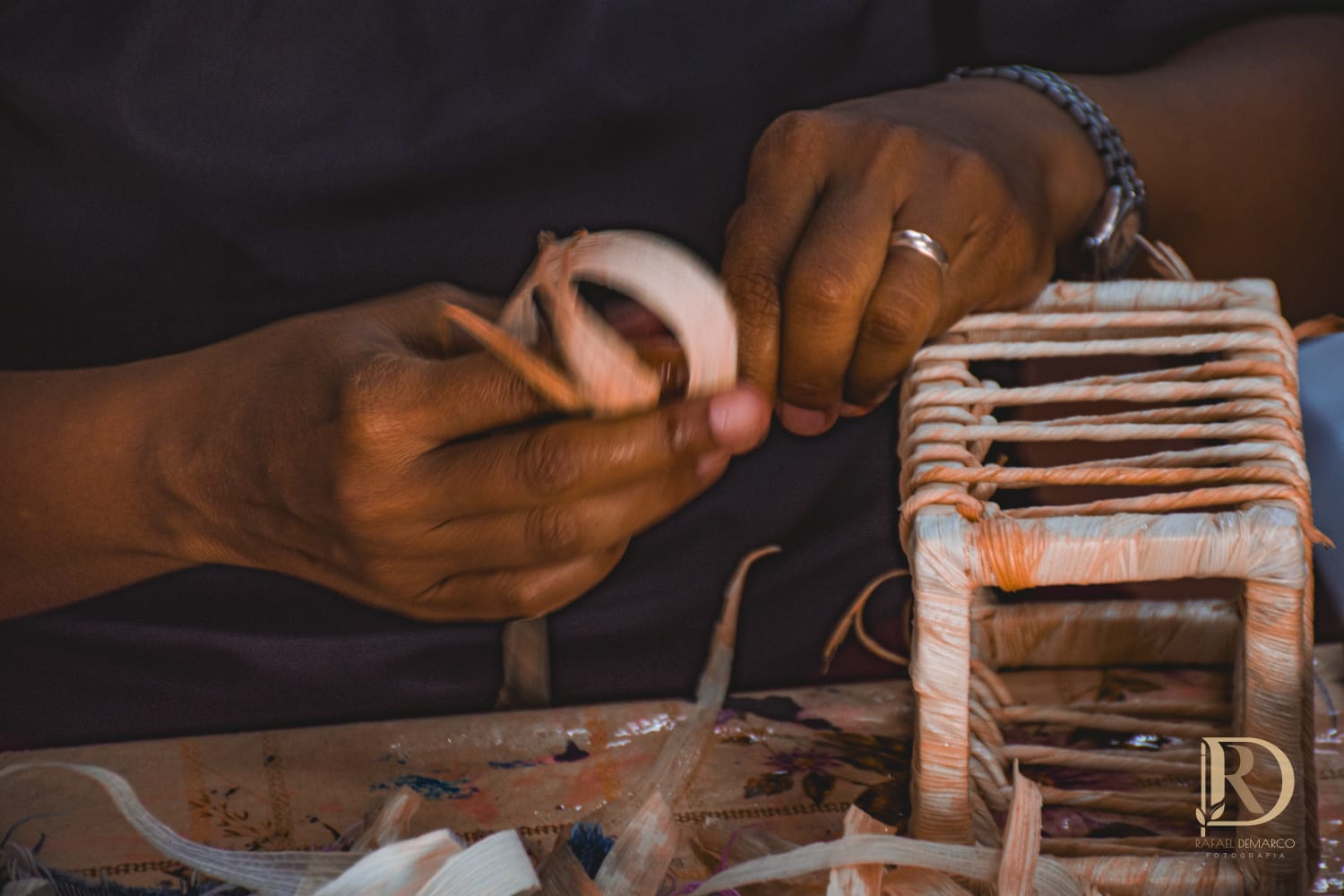 Do trançado de Eliene são elaboradas peças delicadas, de cores luminosas, em pontos precisos que refletem uma rica herança simbólica incorporada na infância. A transmissão das mulheres da família carregou a consciência do valor da cultura do Cariri, da justiça social e do trabalho coletivo.