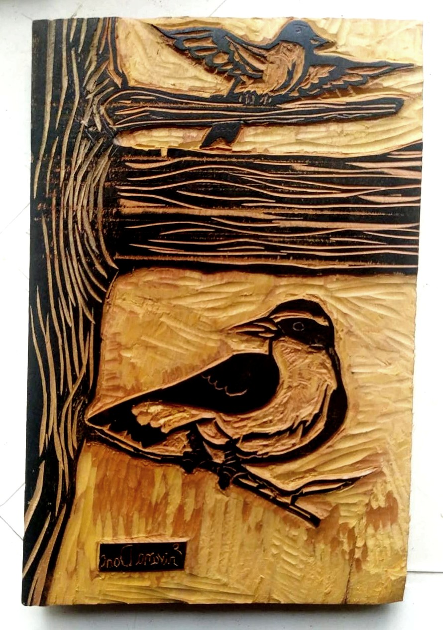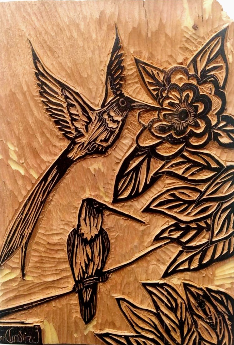 É durante o processo de corte da madeira, seguindo o contorno do desenho, que Erivana revela uma particularidade de sua técnica: ela utiliza o estilete. Cerca de 80% do trabalho é feito com estilete, e apenas 20% com goiva — esta última usada apenas em áreas que exigem a retirada de maior volume de madeira.