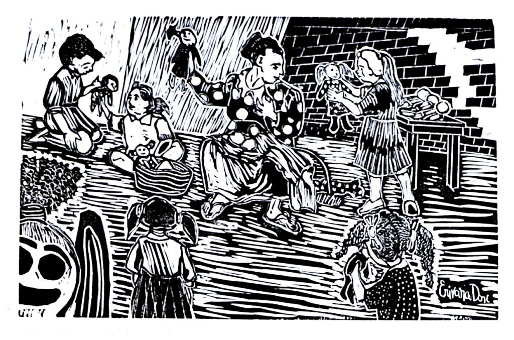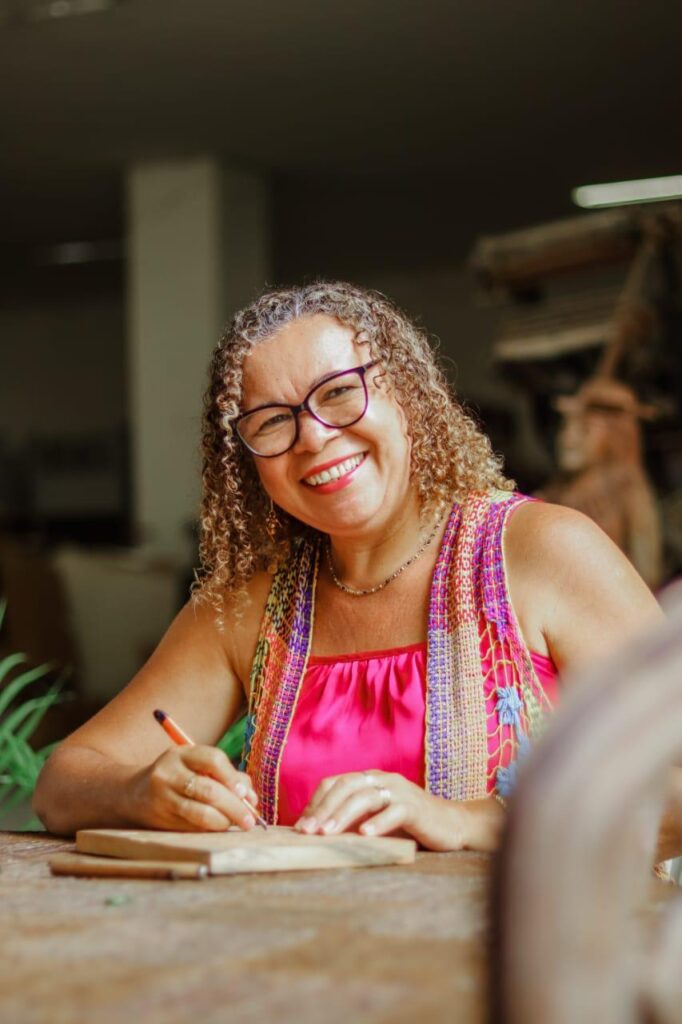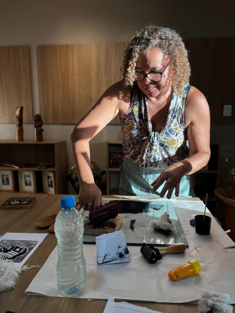 Todos os outros investimentos profissionais que realizou — como biblioteconomista, mestra, pesquisadora, concursada, produtora cultural e escritora — derivaram desse afastamento. No entanto, nunca foi uma ruptura total. Todos esses caminhos foram atravessados pela xilogravura, à qual ela seguia conectada, mesmo que de forma pontual, como pesquisadora e artista. “São 30 anos de xilogravura”, afirma.