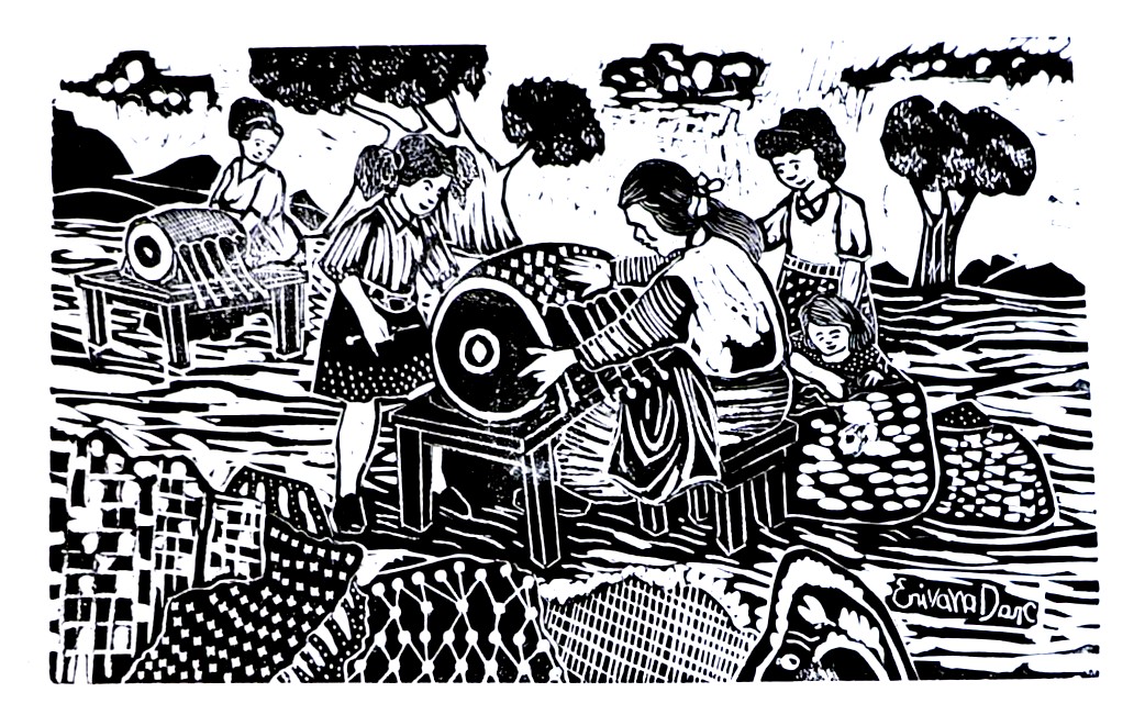 No entanto, ao viver em Juazeiro do Norte, Erivana foi atravessada pela cultura da xilogravura presente na região do Cariri. Na infância, lembra que gostava de desenhar. Na adolescência, não se recorda ao certo como conheceu o curso de xilogravura, nem o que a motivou a participar. Mas lembra vividamente dos efeitos dessa experiência: em 1994, fez um curso de óleo sobre tela, oferecido gratuitamente por um projeto social. Em 1996, ainda no ensino médio, fez um curso com o mestre Abraão Batista. Foram cinco dias de aula. O mestre logo percebeu seu talento e a incentivou: “Você leva jeito, continue.” No último dia, ele levou estiletes e tábuas de umburana para um desafio de xilogravura. Foi a primeira vez que Erivana criou uma obra: um cartão de Natal, com o título Mar e Pássaros, feito para presentear colegas. Ela ainda possui essa peça, que hoje integra a exposição Umburana: Consagração das Mestras, no Centro Cultural do Cariri.