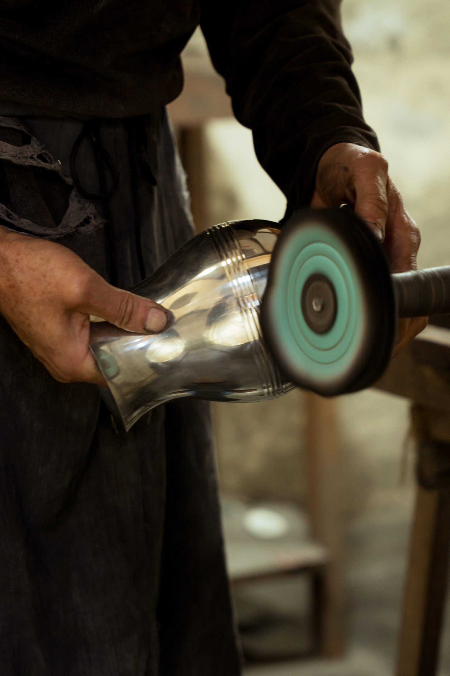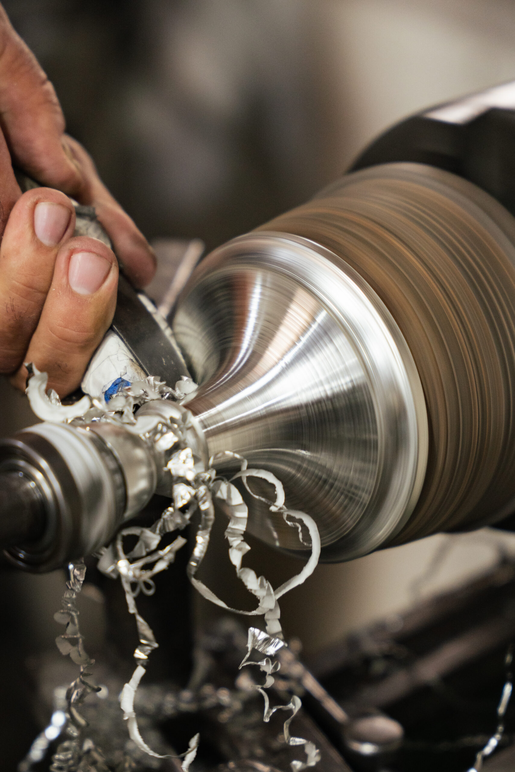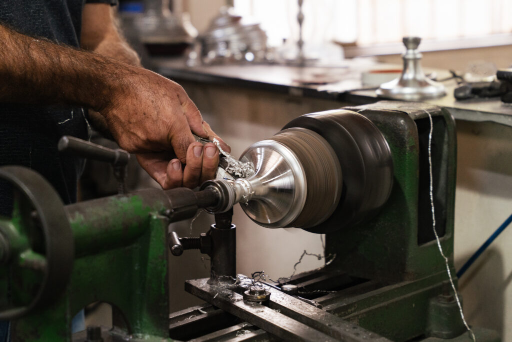 Depois do torneamento, vêm as etapas de acabamento. As peças podem ser polidas ou foscas (o mais procurado), obtido por meio da imersão em uma solução que é como uma queima leve. Por fim, aplica-se uma camada de cera, que sela e protege o metal.