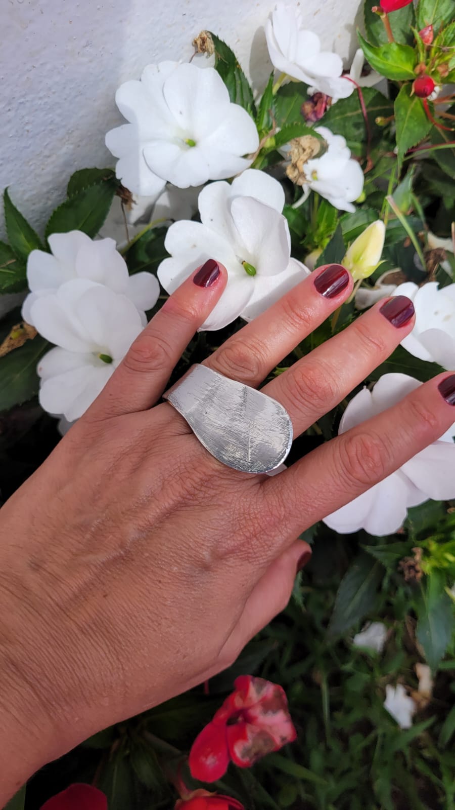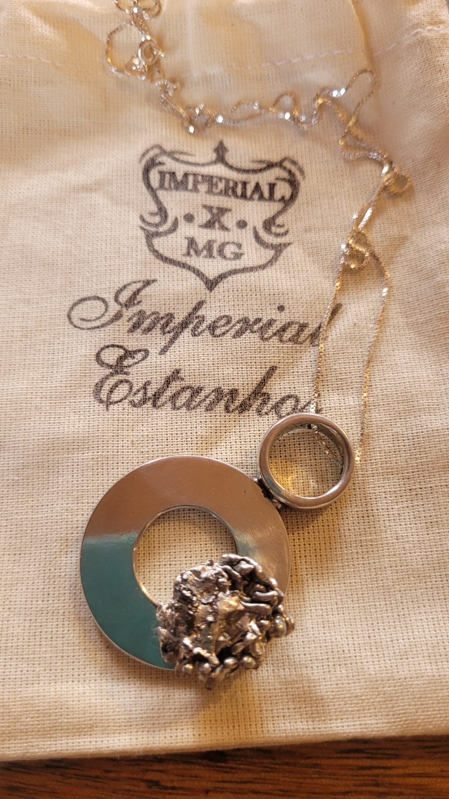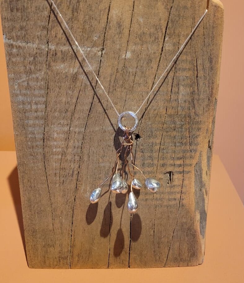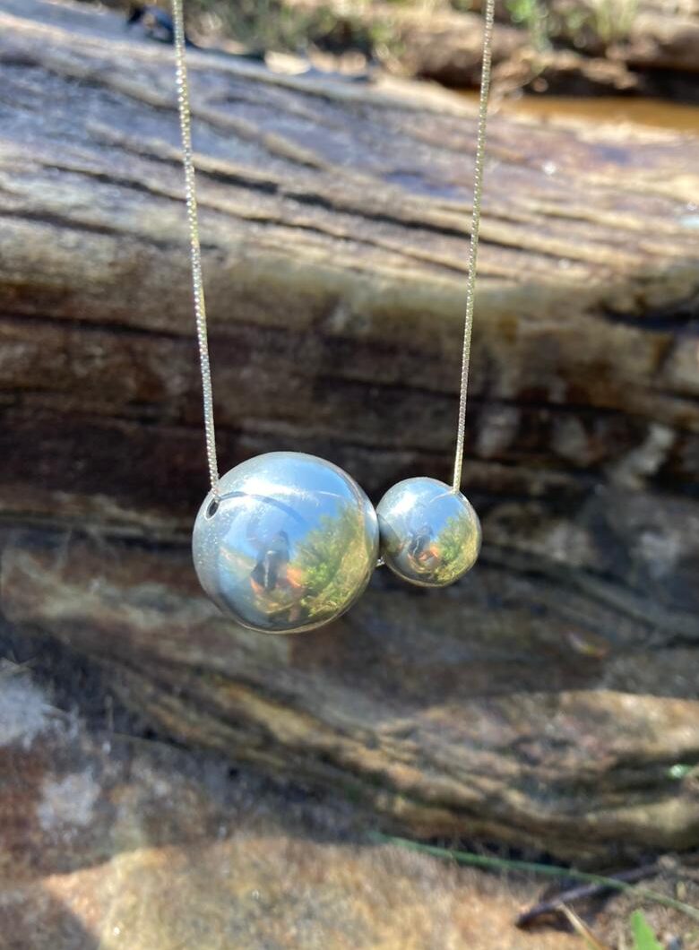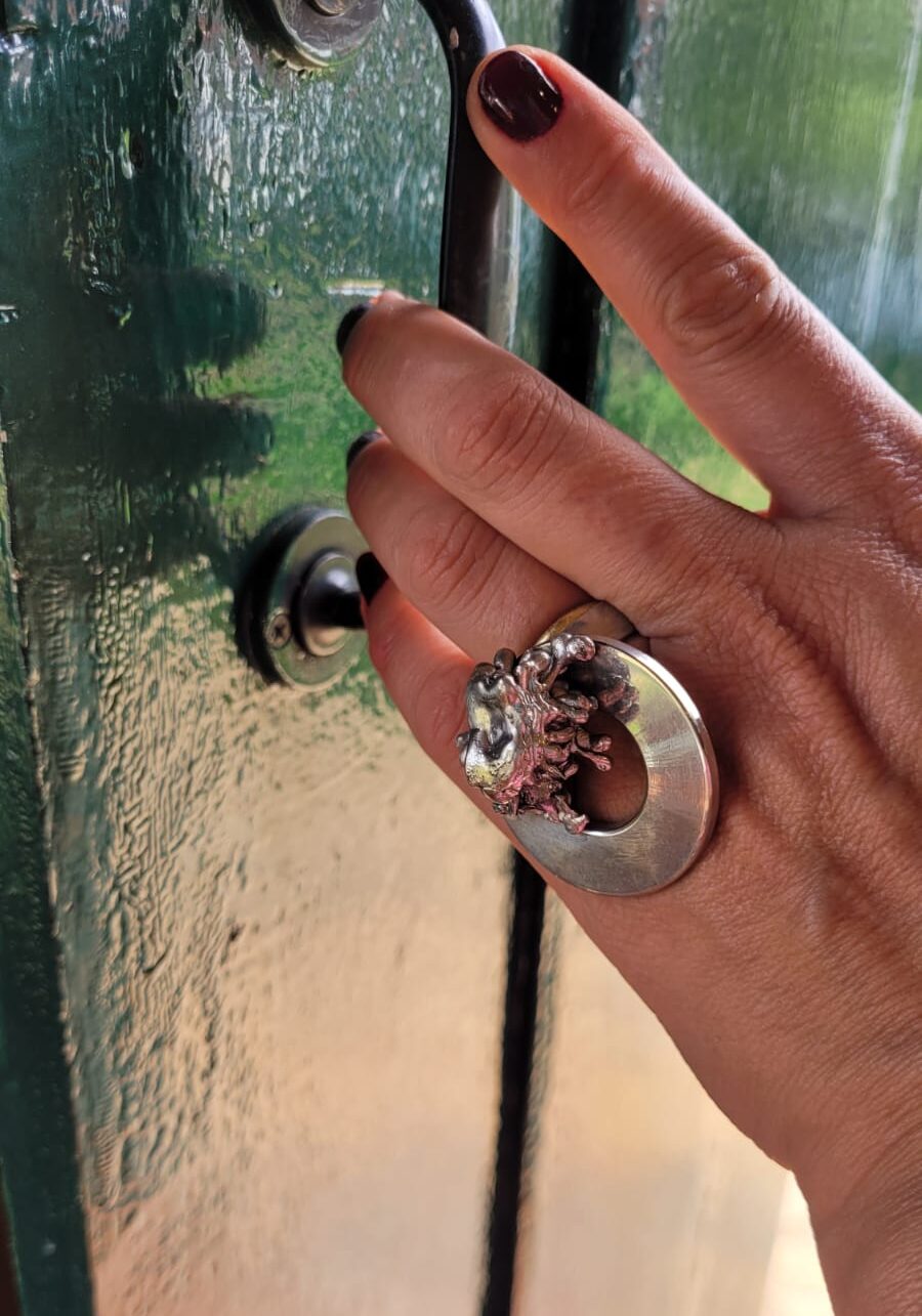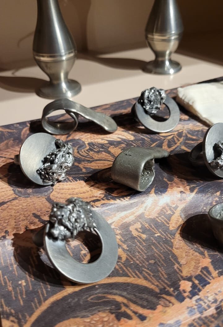Desde 2018, eles produzem joias, essa produção segue outro caminho. Nesse caso, o estanho derretido é gotejado em água fria em movimento, criando formas orgânicas singulares. Há também peças produzidas com moldes de pedra-sabão esculpida, que garantem texturas únicas as joias.