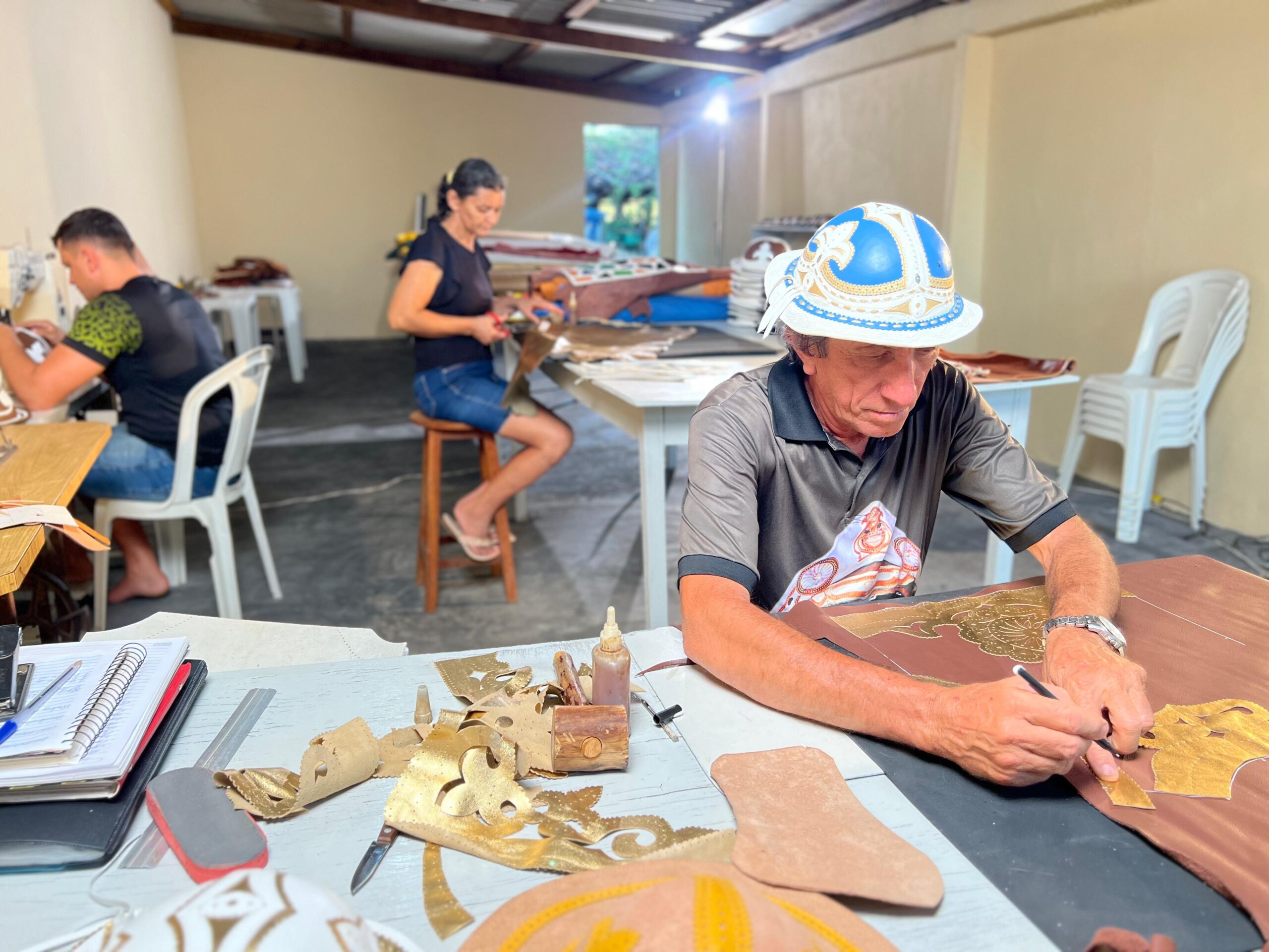 Com o couro de bovinos, caprinos e ovinos, Irineu do mestre produz peças de vestuário, acessórios, como bolsas, cintos e sandálias, além de arreios para os vaqueiros.