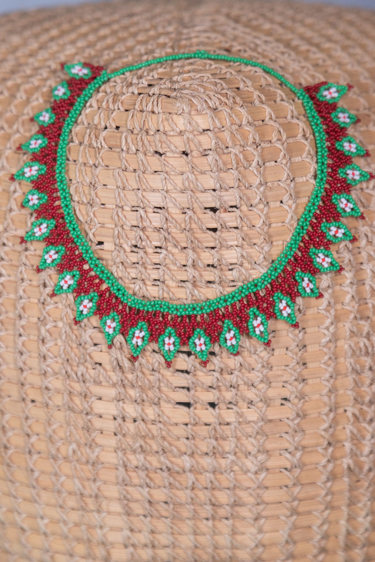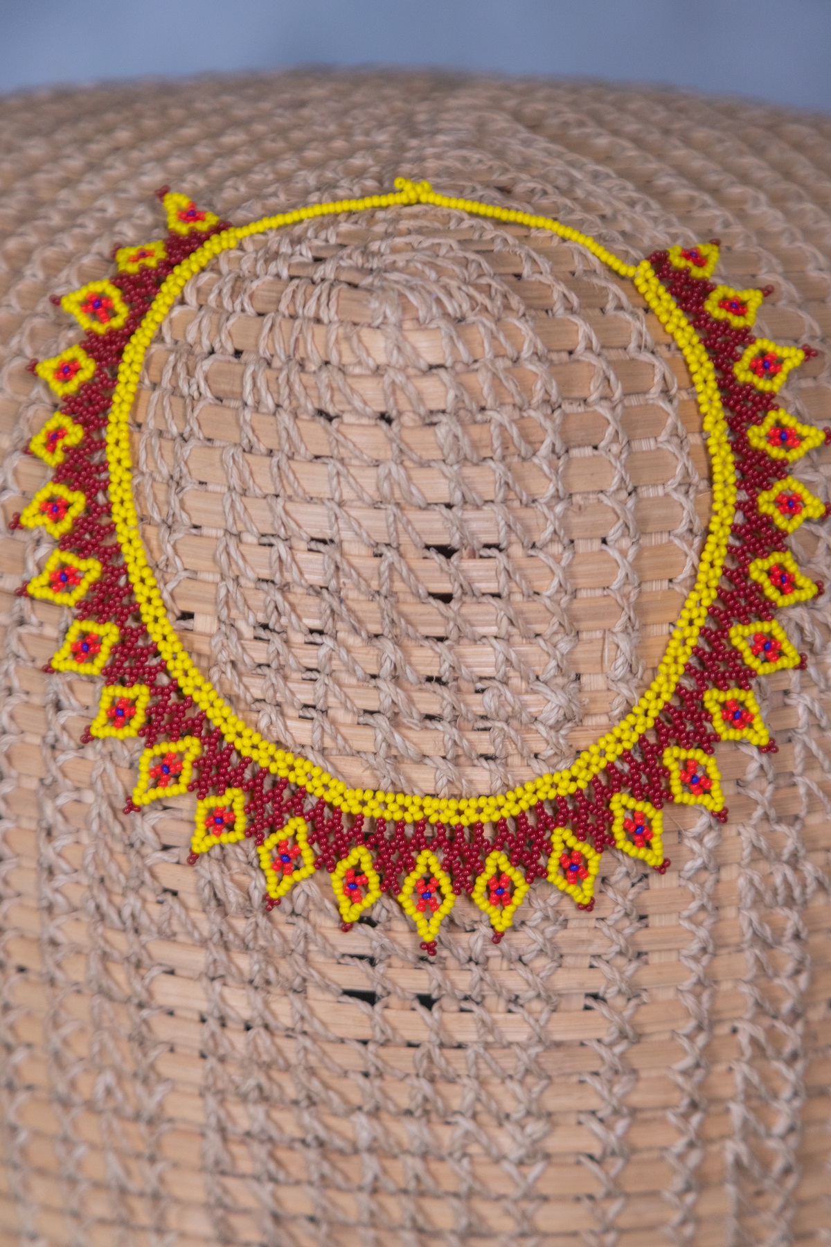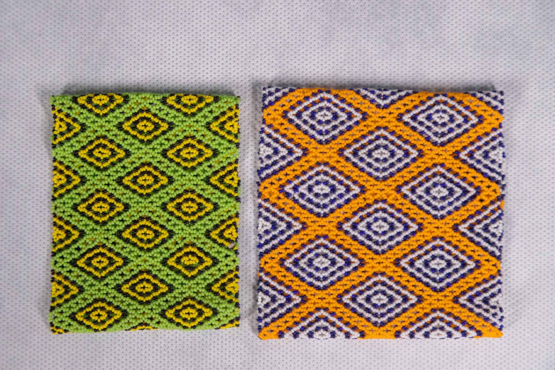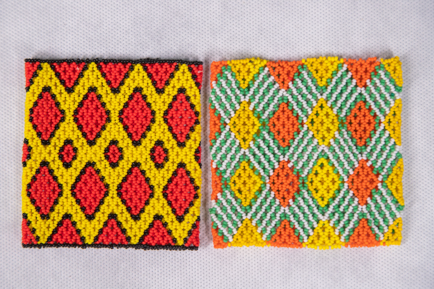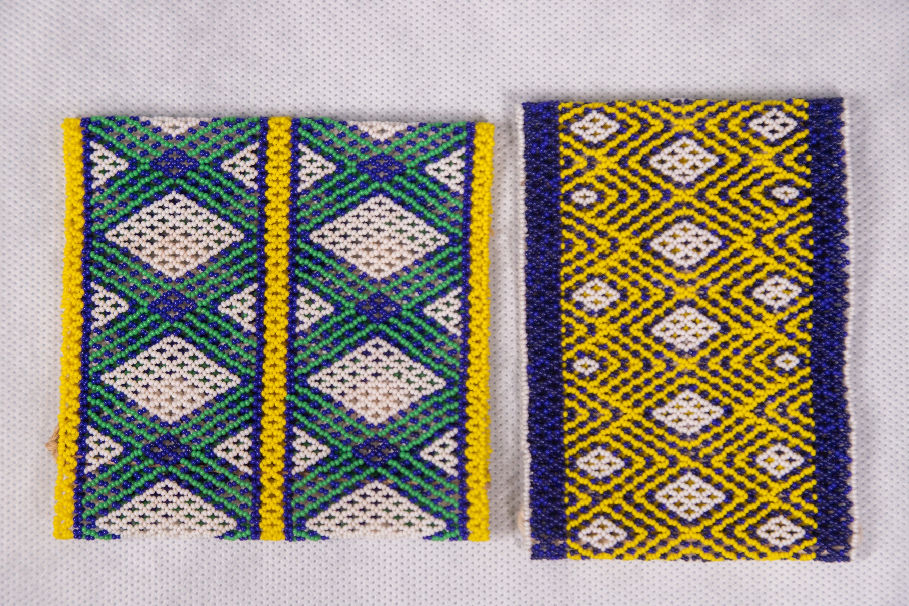Os grafismos tradicionais que adornam suas peças carregam a memória dos grandes arqueiros parakanãs. As pontas de flecha desenhadas nas cestas ecoam tempos em que o arco era ferramenta de caça, proteção e sobrevivência. Estes mesmos padrões aparecem nas peças, onde as miçangas formam desenhos geométricos com significados transmitidos entre as gerações. Hoje, misturadas às linhas coloridas e miçangas trazidas pelo contato com o mundo exterior, essas peças mostram como a cultura parakanã se mantém viva, adaptando-se sem perder sua essência – um diálogo constante entre tradição e presente.