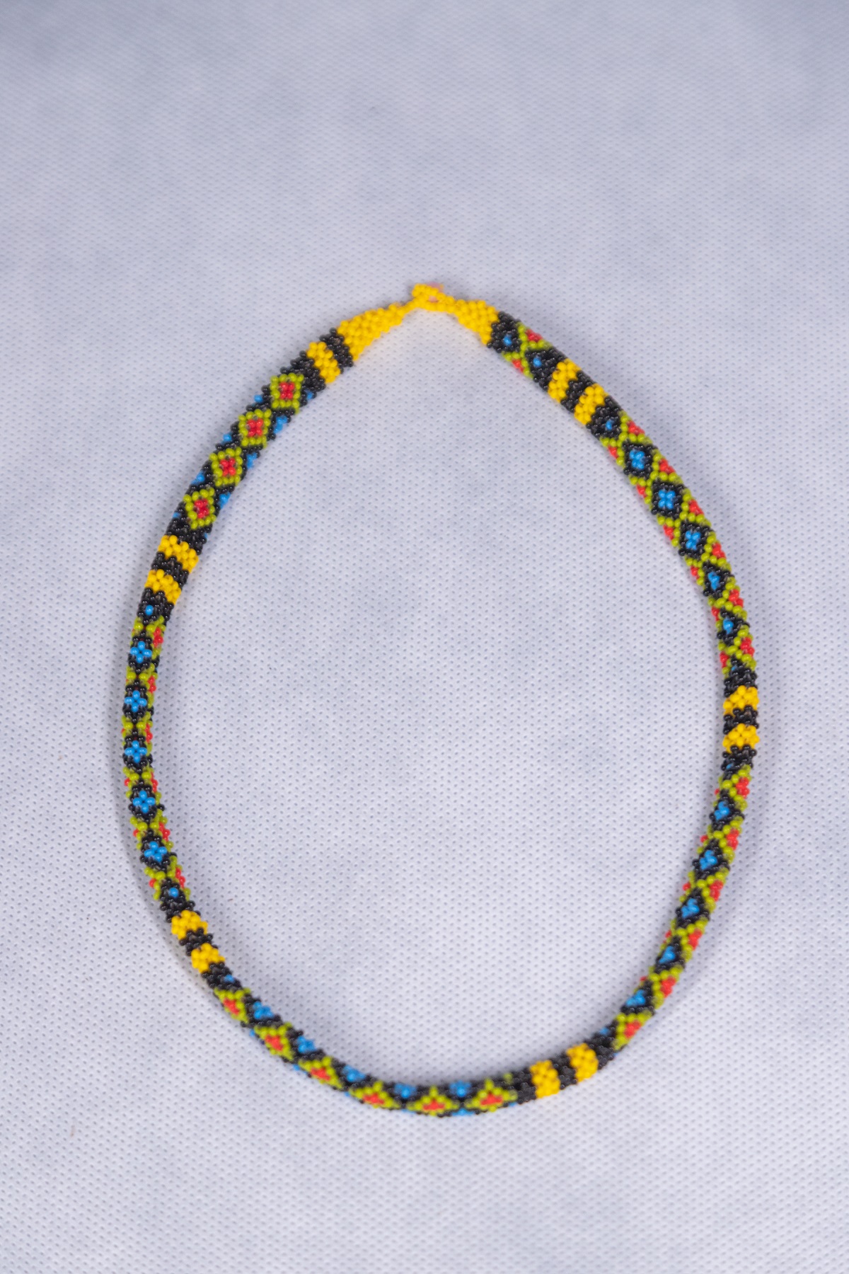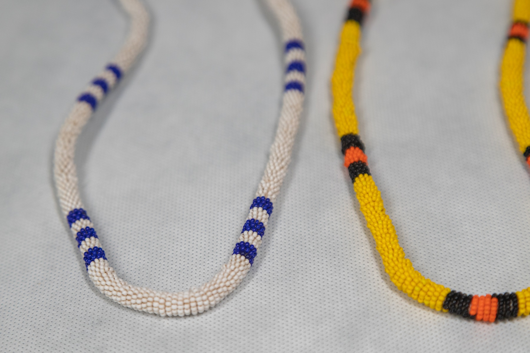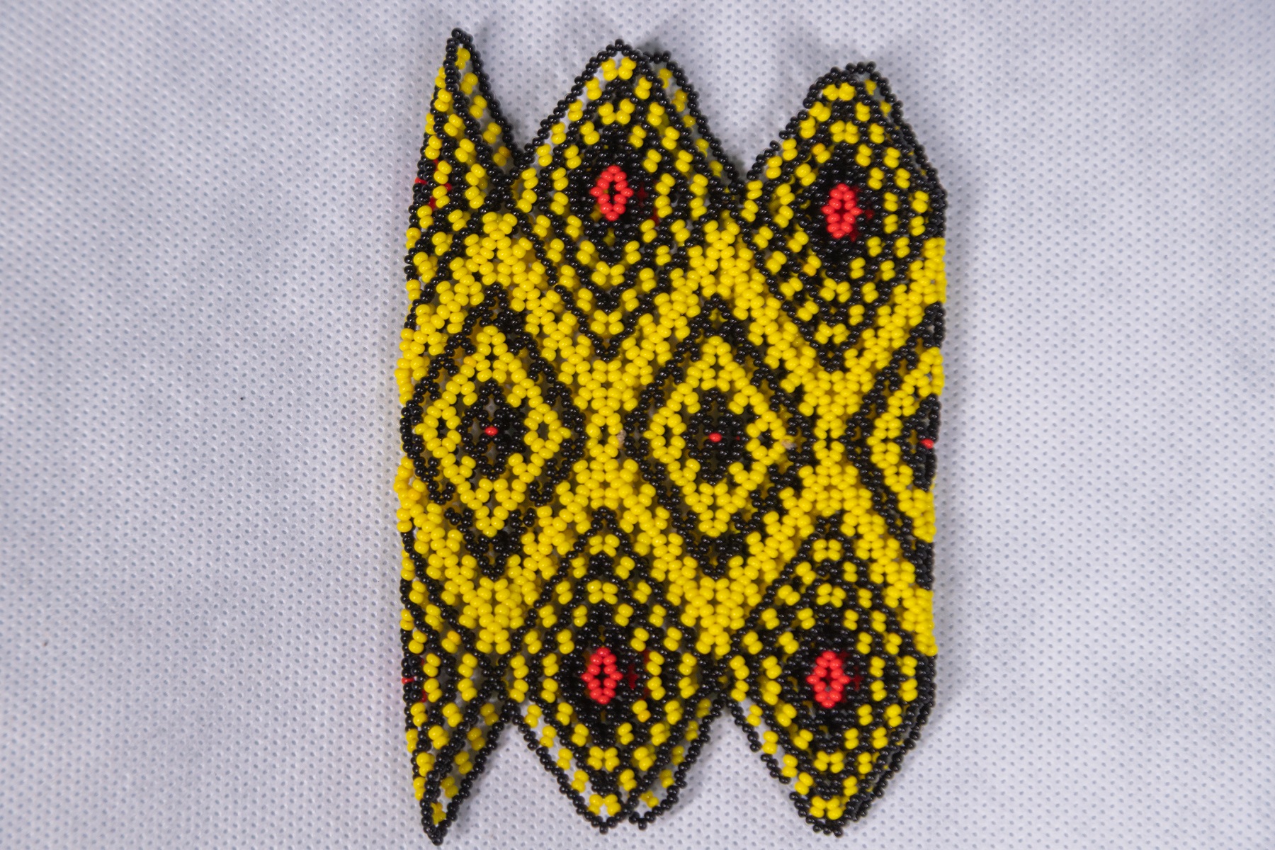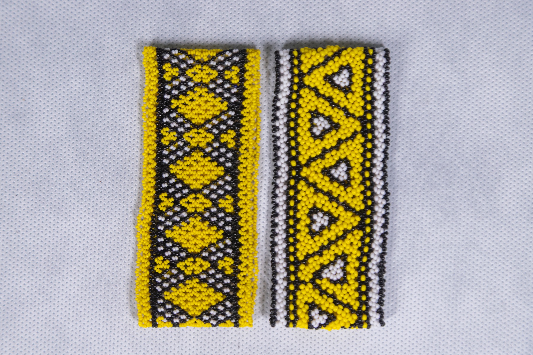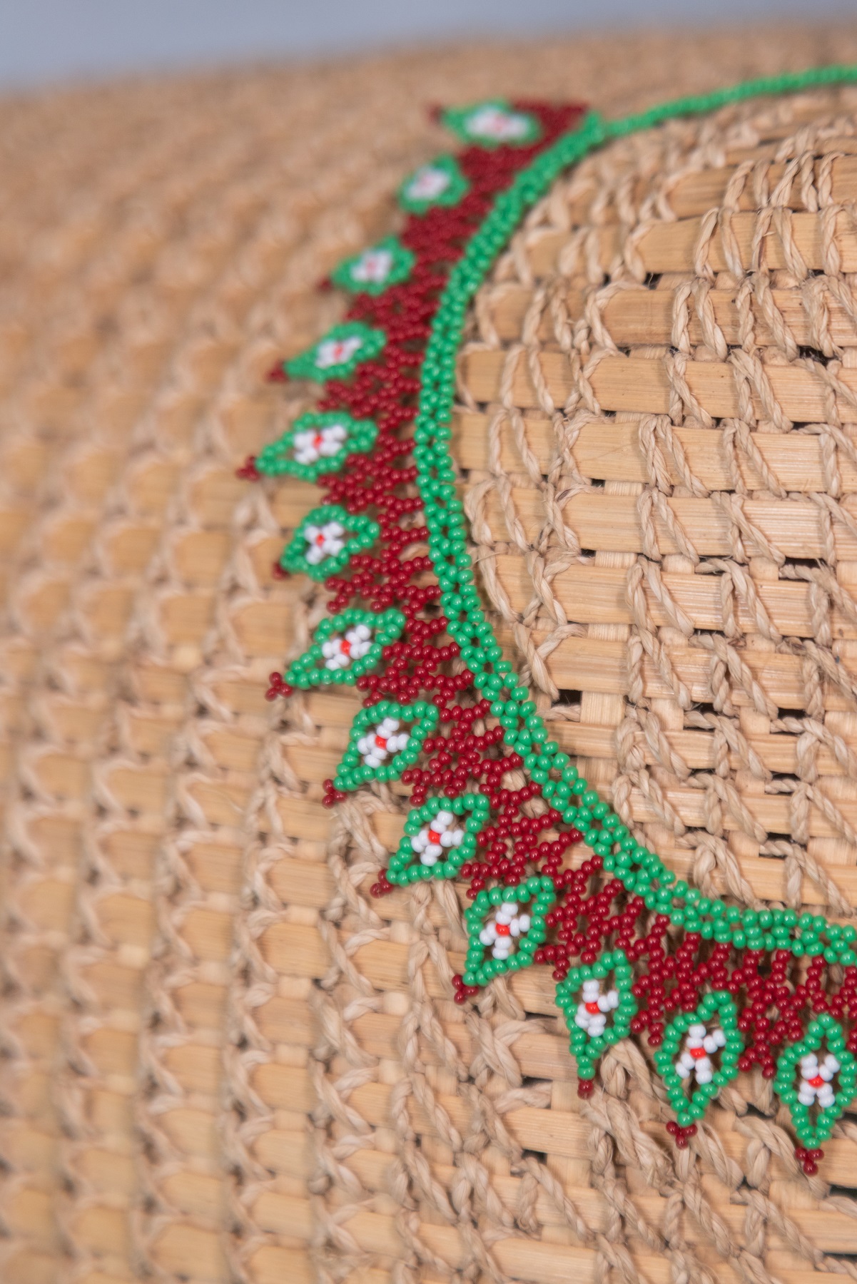 Os grafismos tradicionais que adornam suas peças carregam a memória dos grandes arqueiros parakanãs. As pontas de flecha desenhadas nas cestas ecoam tempos em que o arco era ferramenta de caça, proteção e sobrevivência. Estes mesmos padrões aparecem nas peças, onde as miçangas formam desenhos geométricos com significados transmitidos entre as gerações. Hoje, misturadas às linhas coloridas e miçangas trazidas pelo contato com o mundo exterior, essas peças mostram como a cultura parakanã se mantém viva, adaptando-se sem perder sua essência – um diálogo constante entre tradição e presente.