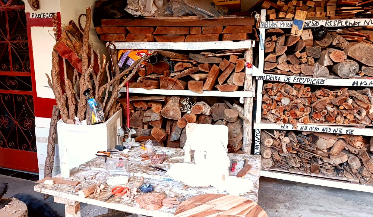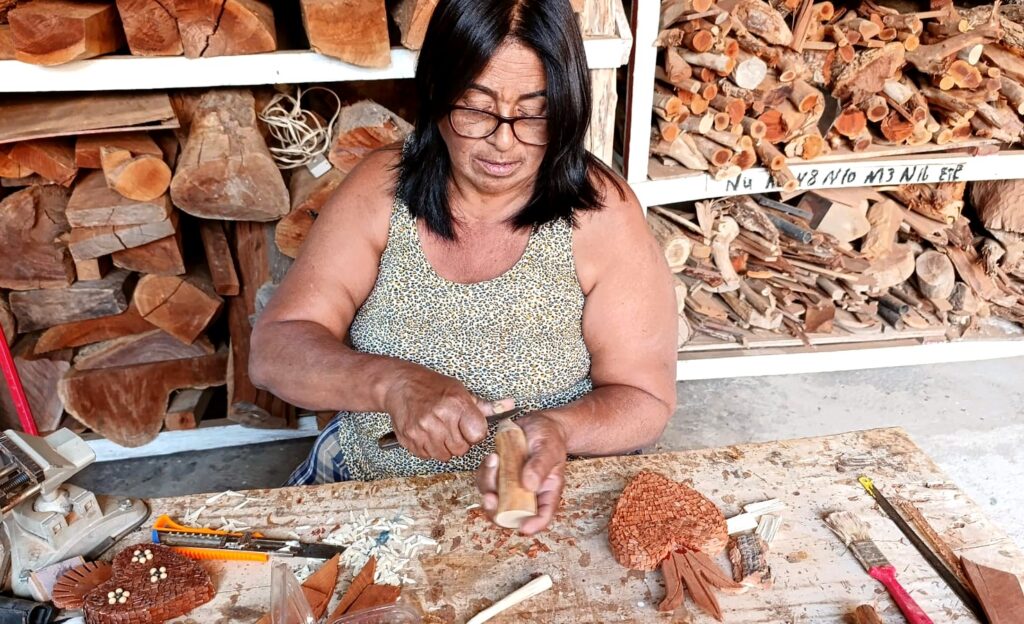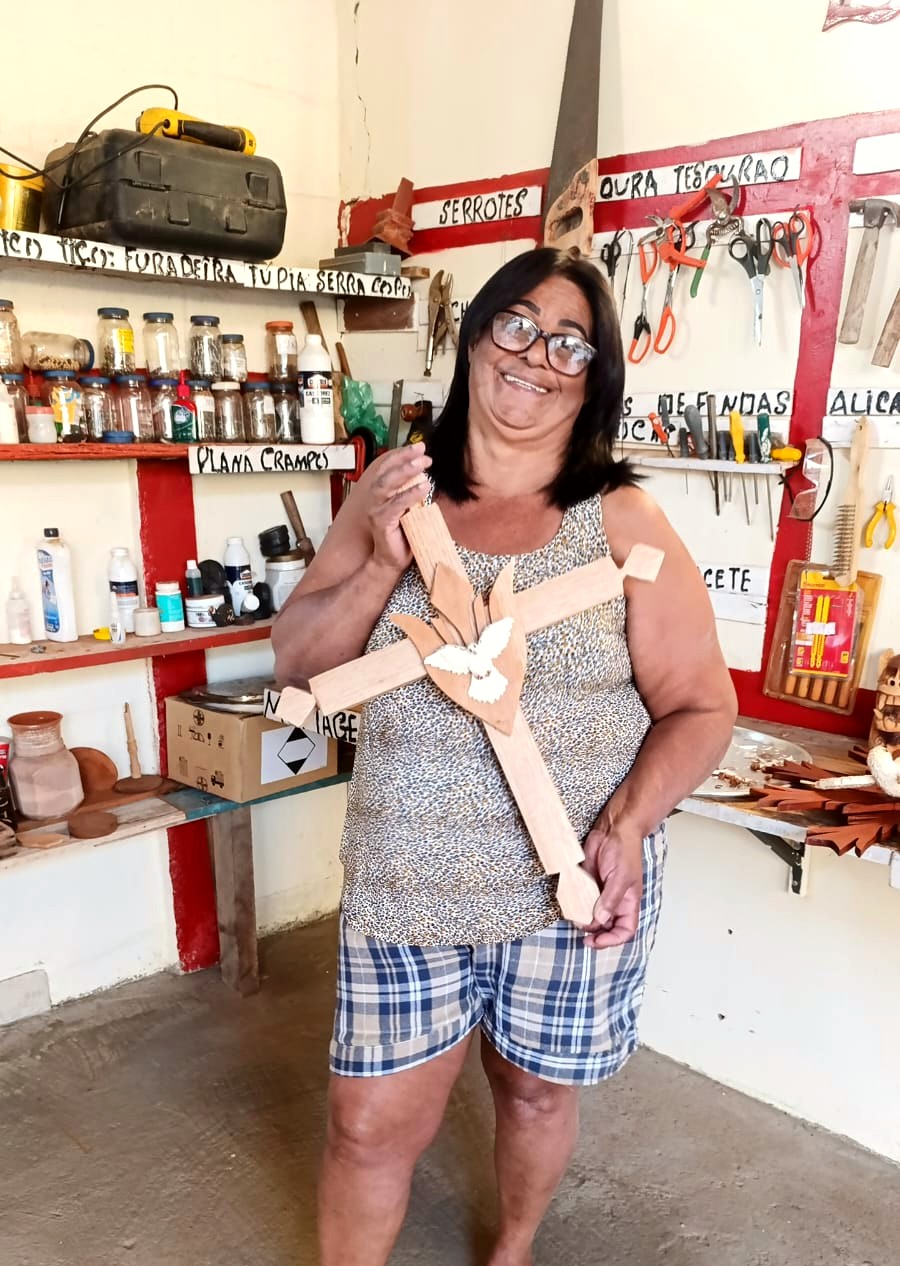 Antes de se dedicar ao entalhe em madeira, Maria Raymunda Otoni trabalhou com os tapetes Arraiolo, técnica de tapeçaria de origem portuguesa que utiliza pontos bordados sobre tela para compor desenhos geométricos ou florais. Esse ofício, aprendido com uma amiga, foi fundamental em sua vida durante muitos anos, permitindo o sustento de sua família. Tal conhecimento chegou a ser repassado por ela em oficinas ministradas na cidade de Presidente Kubitschek, Minas Gerais. Mais tarde, Maria participou de um curso de entalhe do Divino promovido pela prefeitura de Datas, sua cidade, e ali encontrou sua verdadeira vocação. Desde então, há mais de 10 anos, trilha de forma independente seu caminho como artesã da madeira, conquistando reconhecimento pela criatividade e pela capacidade de inovar nos formatos e nas peças. Para ela, o artesanato é mais do que fonte de renda: é lugar de orgulho, realização e encontro. Uma de suas experiências mais marcantes foi sua primeira feira, em Natal, onde além de vender suas peças, criou amizades que mantém até hoje. Atualmente, Maria sonha em transmitir seus saberes a novos aprendizes, fortalecendo a tradição em sua comunidade.