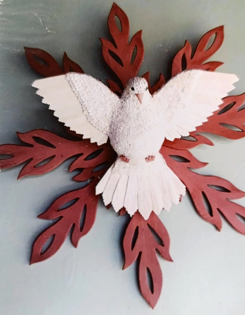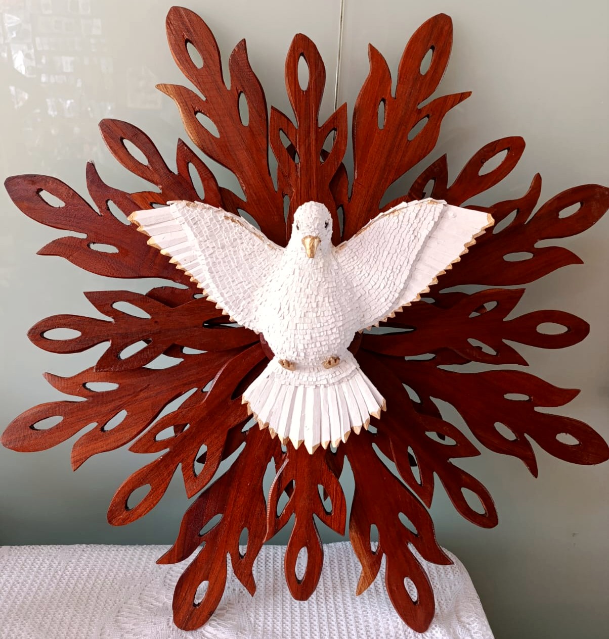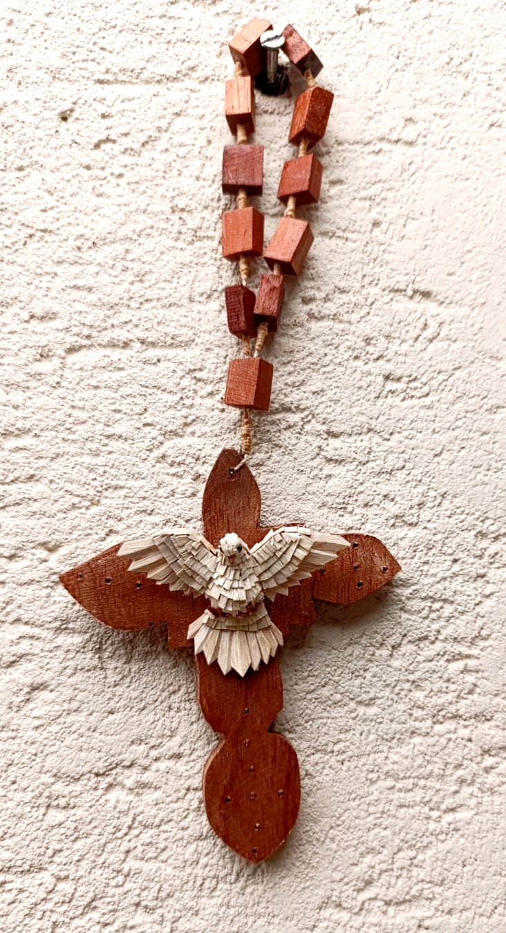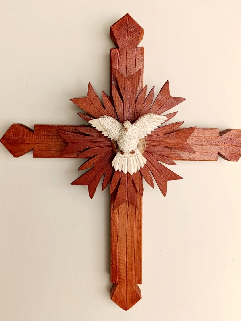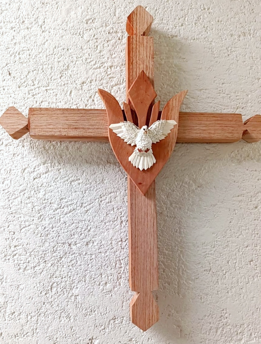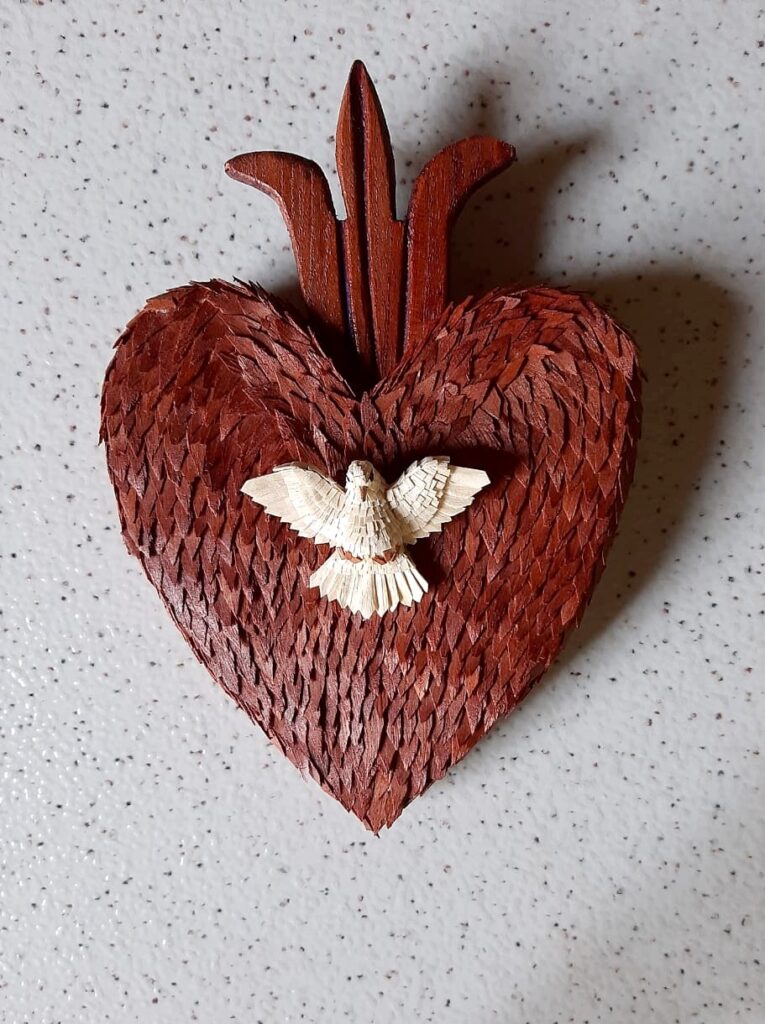 É nesse universo simbólico que Maria Raymunda dedica seu trabalho. Suas criações incluem resplendores, corações com o Divino, pratinhos, terços, presépios e crucifixos — peças sempre inspiradas na figura da pomba branca em diferentes formas. O processo é minucioso: a madeira clara, como o cedro ou o amendoim-do-campo, é talhada com facão e enxó até atingir a espessura ideal. Em seguida, cortes delicados de canivete moldam o corpo da ave. As asas e a cauda são esculpidas à parte e, depois, as penas ganham forma a partir de pequenas lascas de madeira coladas uma a uma, num trabalho paciente que dá volume ao Divino. Por fim, a peça é lixada e selada, revelando a leveza e o brilho natural do material. Assim, cada escultura preserva uma tradição secular carregando, ao mesmo tempo, a marca singular da artesã.