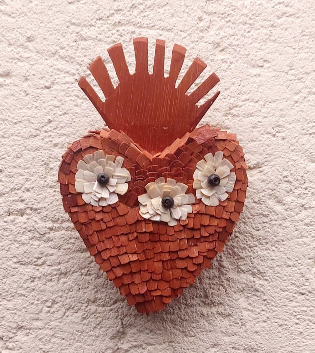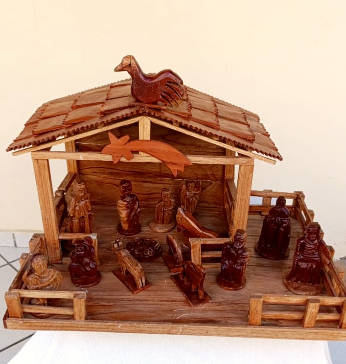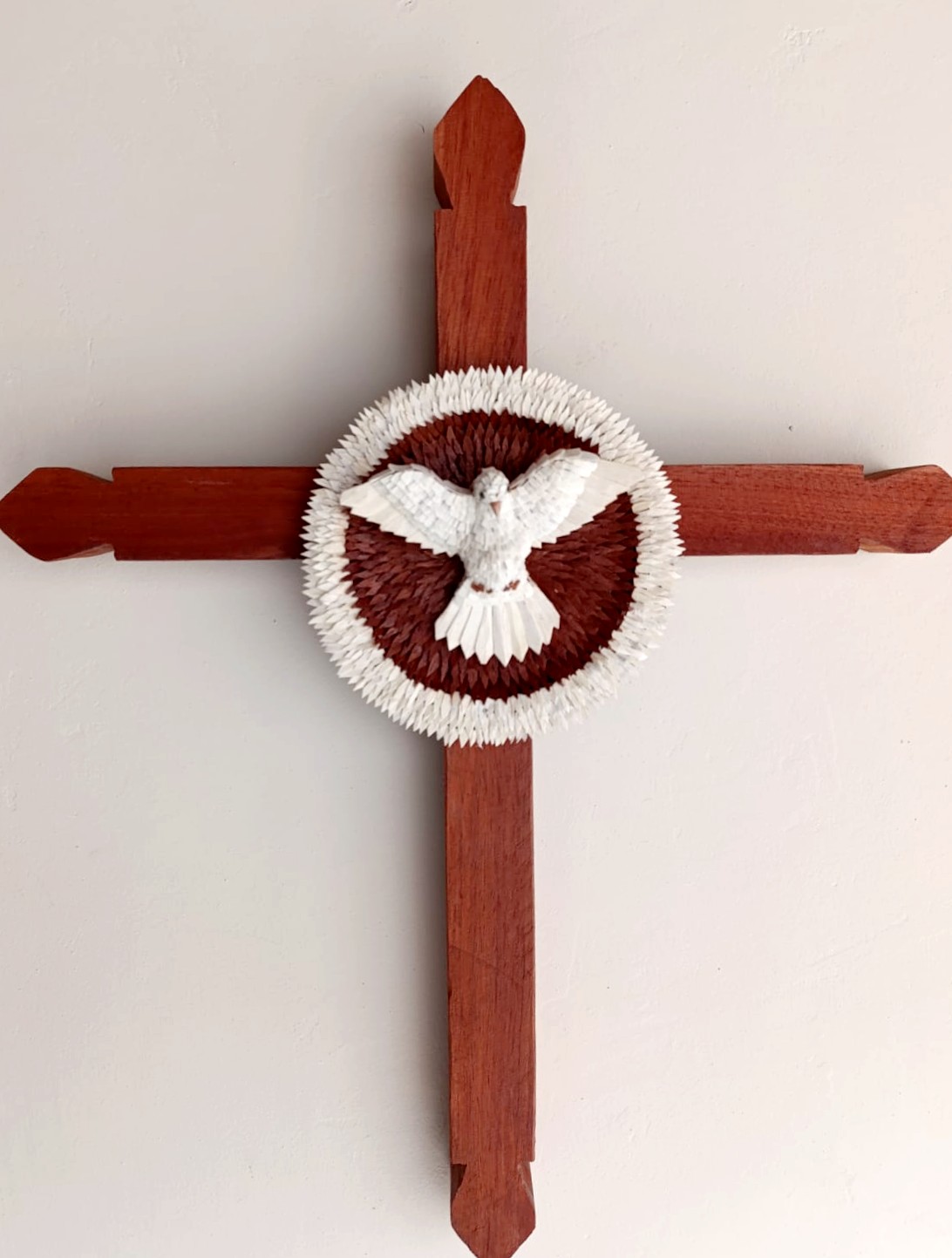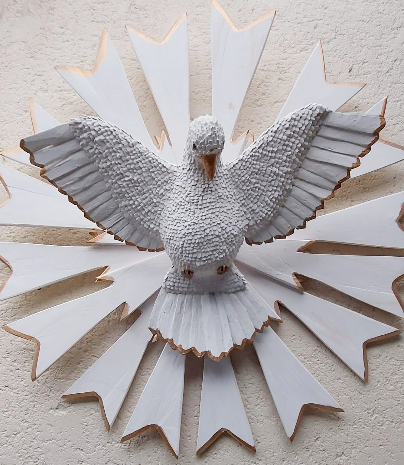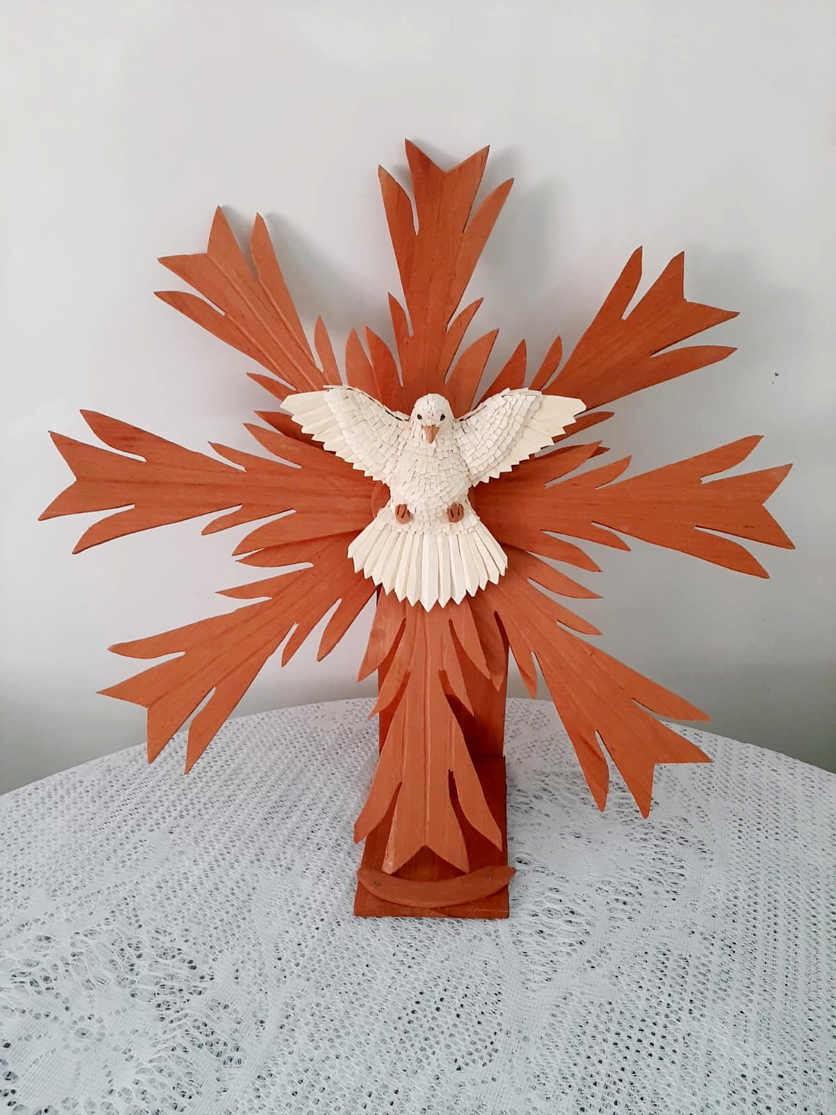 É nesse universo simbólico que Maria Raymunda dedica seu trabalho. Suas criações incluem resplendores, corações com o Divino, pratinhos, terços, presépios e crucifixos — peças sempre inspiradas na figura da pomba branca em diferentes formas. O processo é minucioso: a madeira clara, como o cedro ou o amendoim-do-campo, é talhada com facão e enxó até atingir a espessura ideal. Em seguida, cortes delicados de canivete moldam o corpo da ave. As asas e a cauda são esculpidas à parte e, depois, as penas ganham forma a partir de pequenas lascas de madeira coladas uma a uma, num trabalho paciente que dá volume ao Divino. Por fim, a peça é lixada e selada, revelando a leveza e o brilho natural do material. Assim, cada escultura preserva uma tradição secular carregando, ao mesmo tempo, a marca singular da artesã.
