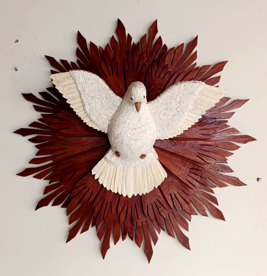 A celebração do Divino Espírito Santo é uma herança cultural de origem portuguesa que se consolidou como uma das expressões religiosas mais conhecidas do Brasil. Sua representação mais marcante é a pomba branca, símbolo da paz e da presença divina, geralmente envolta por raios dourados que remetem à luz celestial. Ao longo dos séculos, essa imagem passou a ocupar tanto os altares das igrejas quanto os lares, em pequenas esculturas e enfeites usados nas festas do Divino, especialmente em Minas Gerais e no interior do Brasil.
