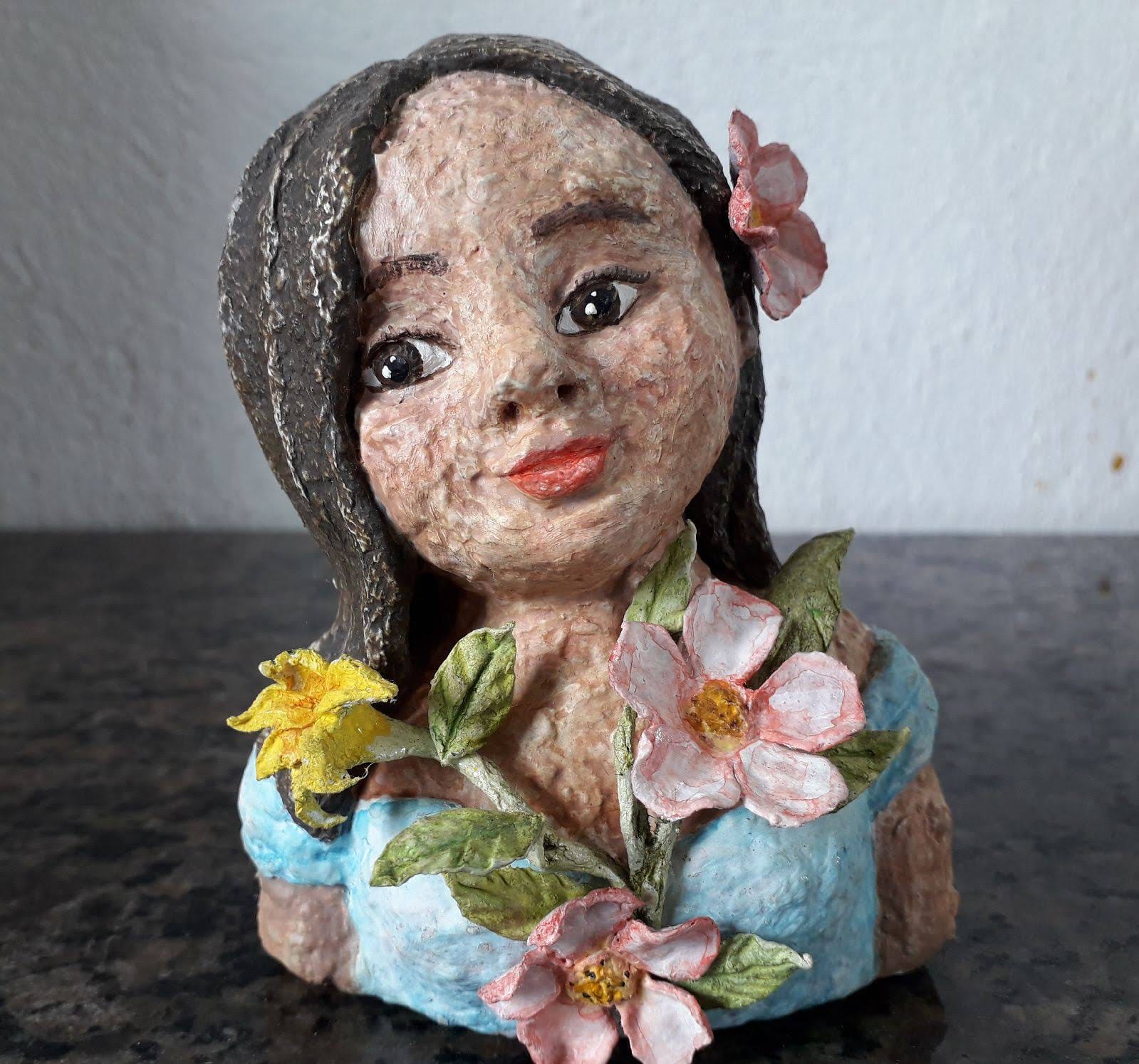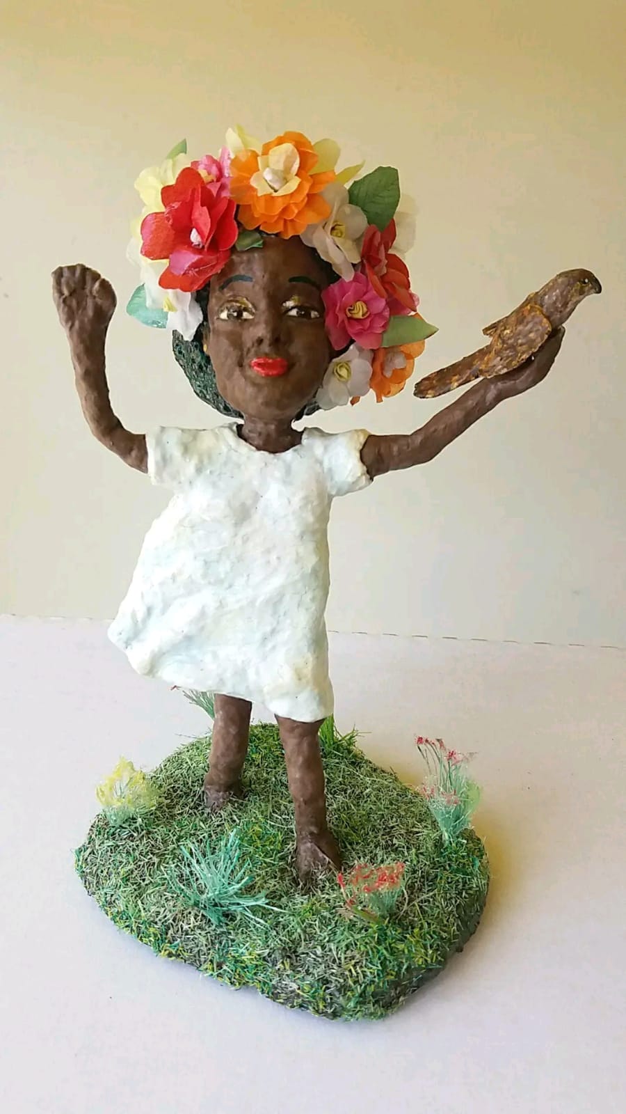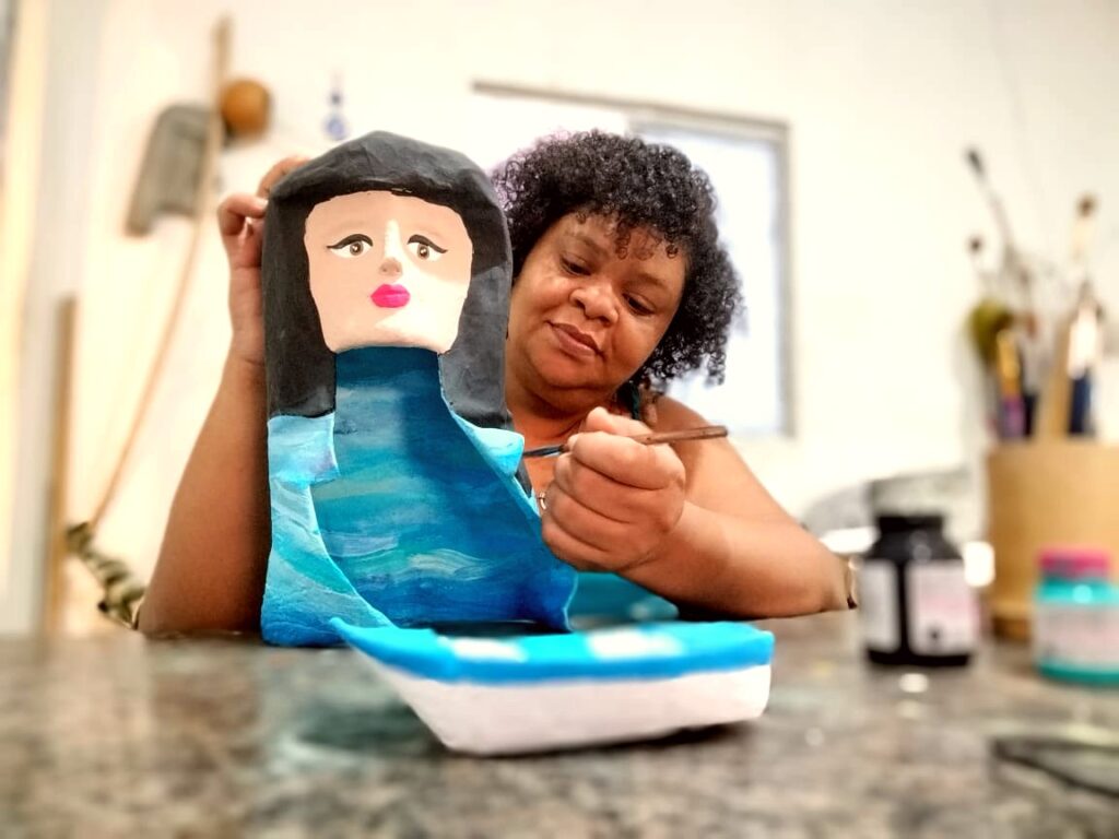 Roberta Lira Donato, nascida em Olinda/PE, tem contato com a modelagem desde os 19 anos. À época, aprendeu a fazer flores em biscuit com a tia. Com os anos, se aperfeiçoou, fazia topos para bolos de aniversário, “me descobri autodidata na modelagem, não fiz curso, aprendi sozinha”, encontrando os limites no uso do biscuit, decidiu experimentar outros materiais, e foi aí que conheceu o papel machê. Em 2017 fez as primeiras tentativas, utilizando papéis de notas, folhas de velhos livros, cola branca e gesso. Modelou esculturas de crianças, em um primeiro momento. A prática lhe levou a melhorar os acabamentos, e a técnica, que conta com camadas de papel machê, papietagem e pintura minuciosa, deram origem à bonecos de traços mais delicados, crianças de olhar sonhador com pipas que parecem prestes a lhes escapar das mãos.