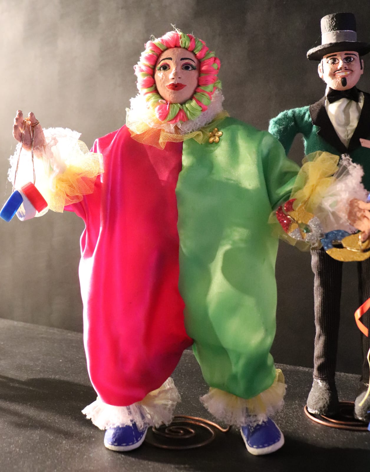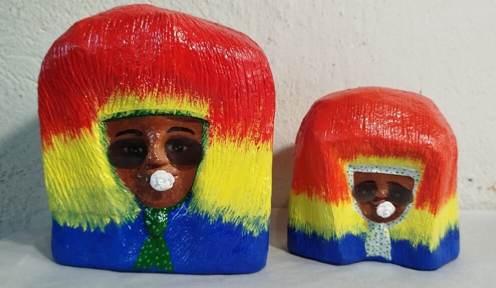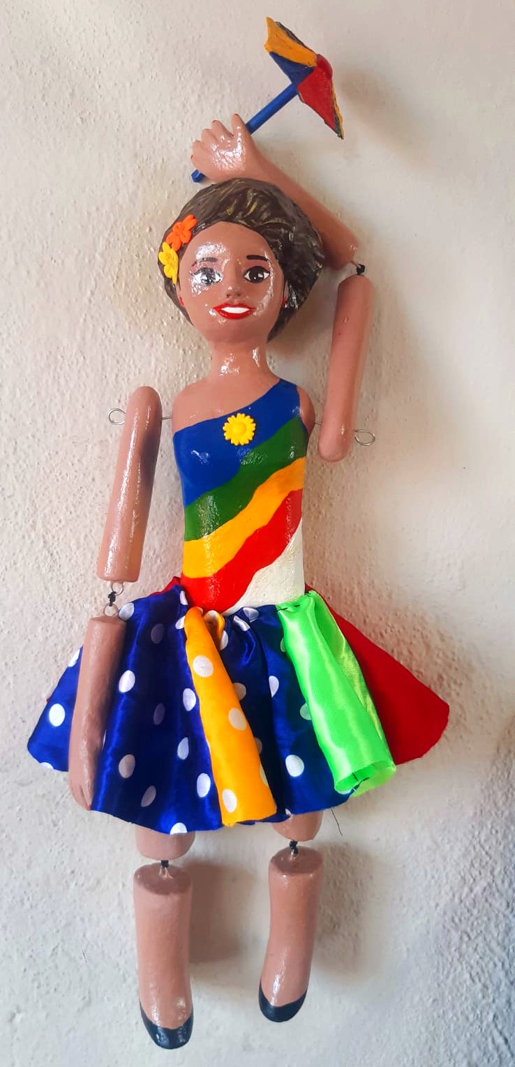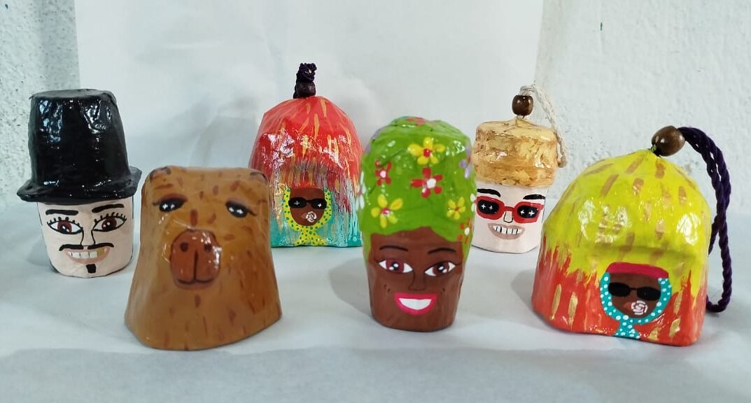 Roberta utiliza as técnicas da papietagem e papel machê para dar vida a personagens da cultura popular Pernambucana, como crianças brincando, bonecas e esculturas que são ricas em cores e expressões.