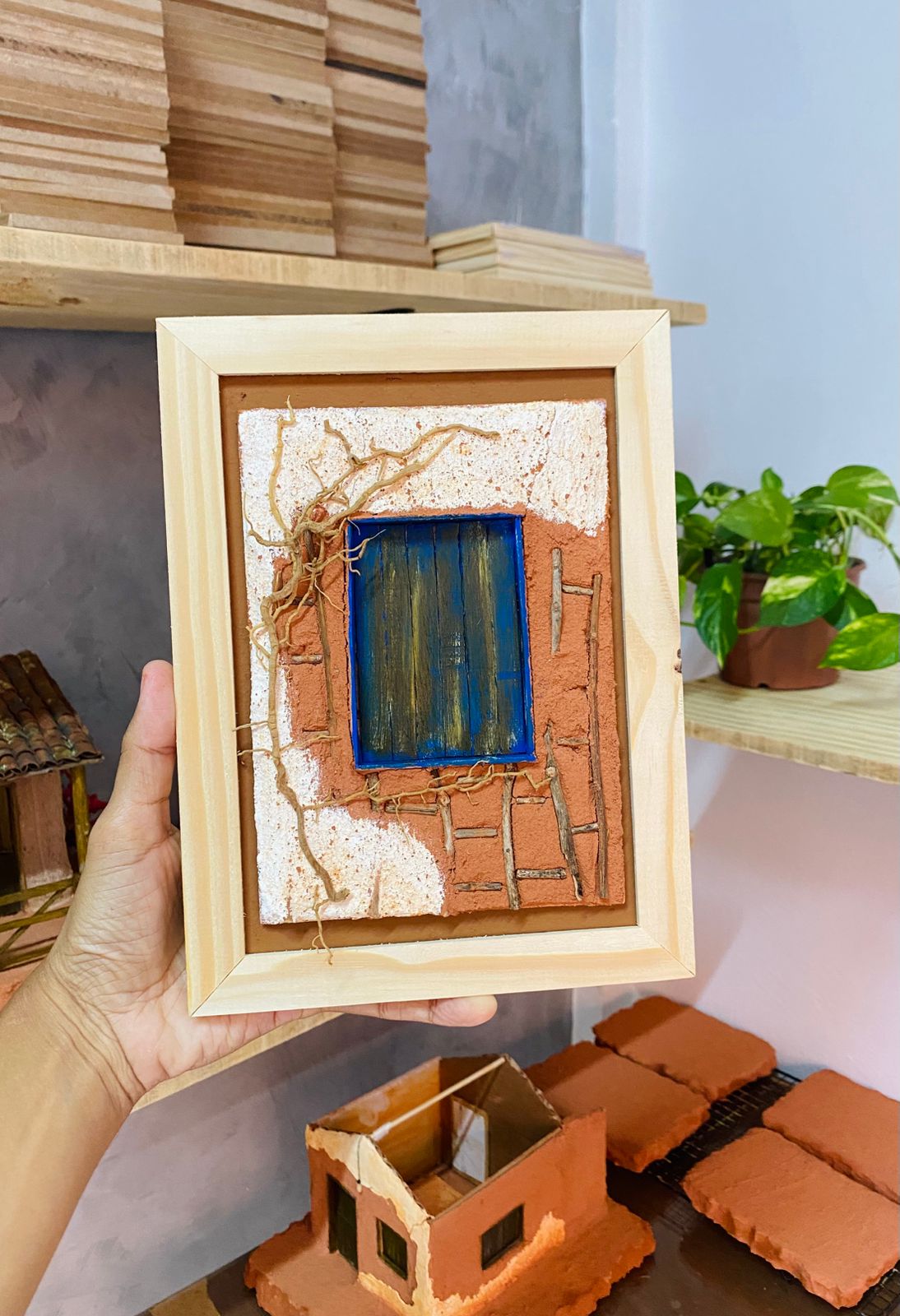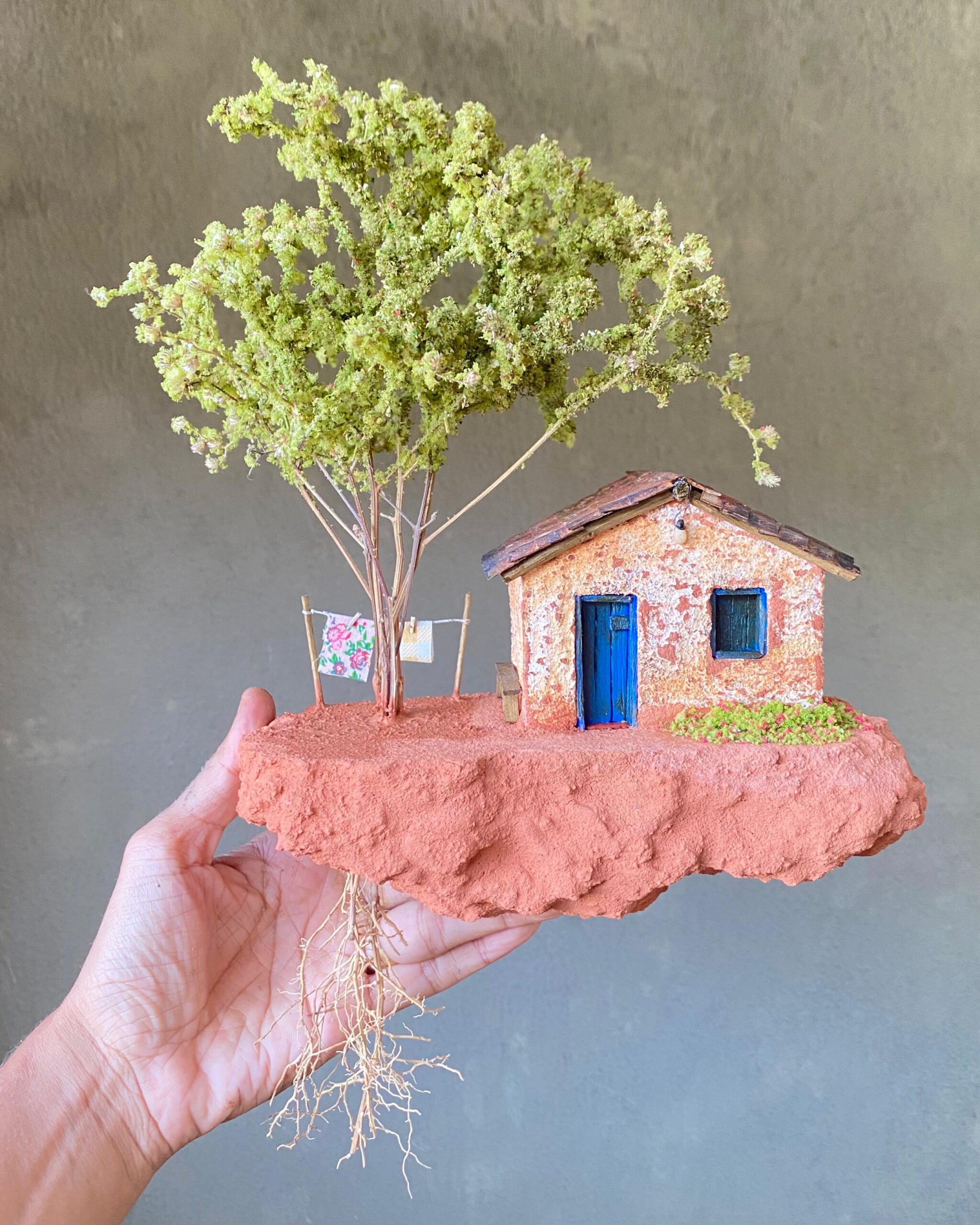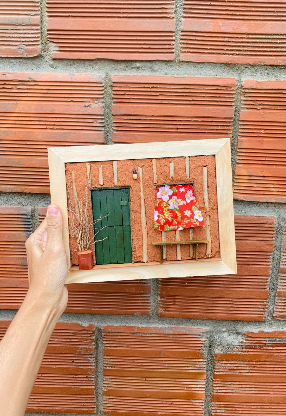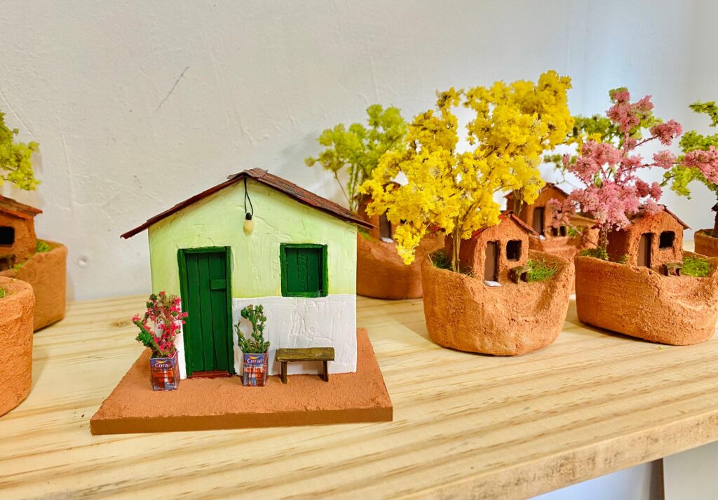 Em seu ateliê, Sthefany orquestra uma sinfonia de transformações onde cada elemento descartado pelo mundo encontra sua redenção poética. Os gravetos de cidreira que seu pai cortou no quintal tornam-se a estrutura que sustenta sonhos em miniatura; embalagens de café transformam-se em telhas que protegem pequenos lares da chuva imaginária; palitos de picolé renascem como portinhas que se abrem para o passado. É uma alquimia particular onde o “lixo” vira arte, onde o esquecido volta a ter valor, numa manifestação silenciosa, mas poderosa de sustentabilidade que vai muito além do meio ambiente, ela sustenta também a alma de uma cultura.