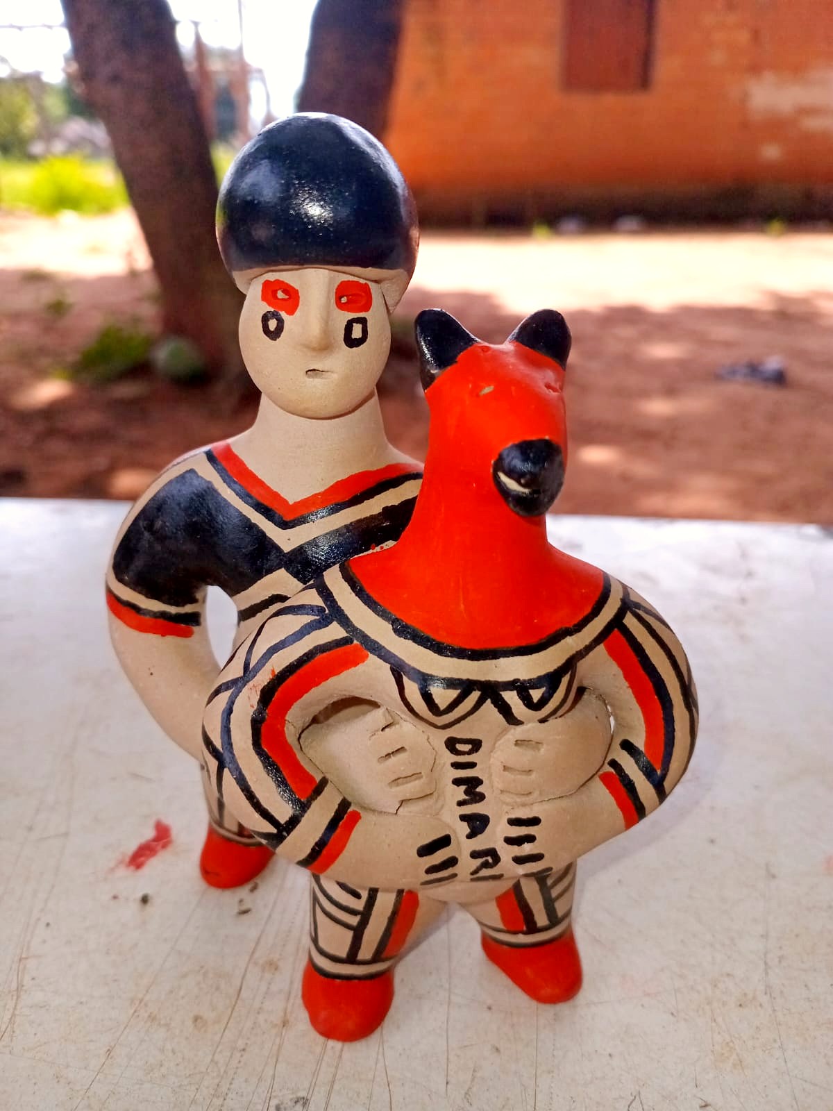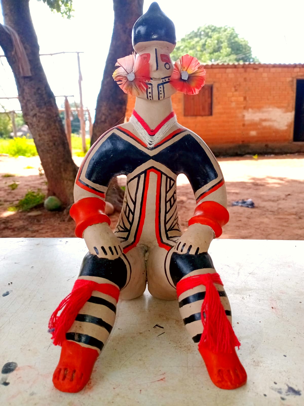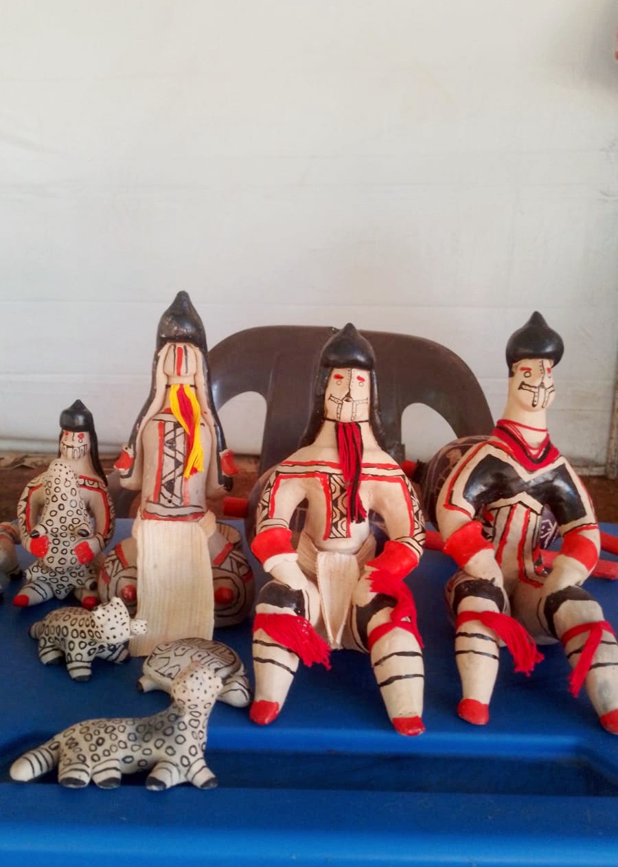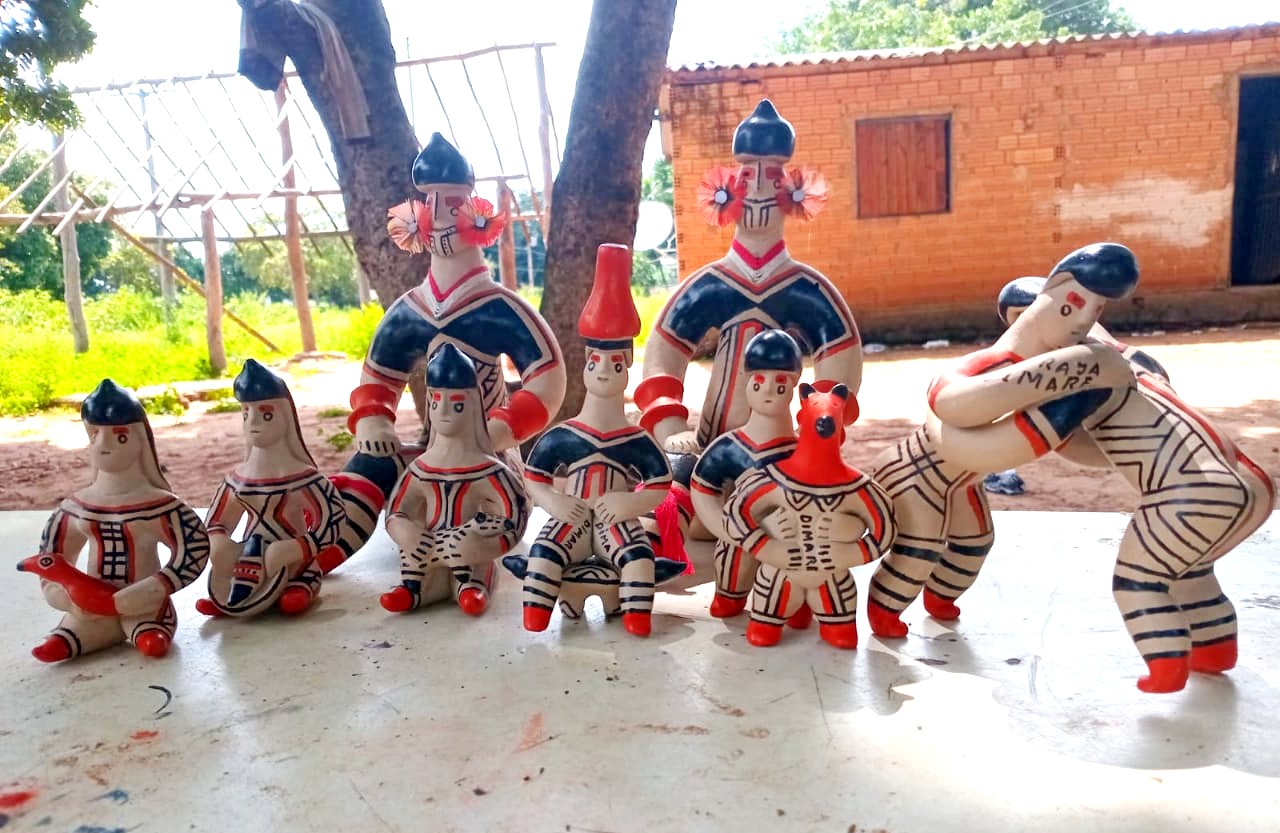 Junto com sua equipe, Taffarel também cria bonecas de cerâmica que guardam histórias milenares. O barro é coletado do outro lado do rio, na divisa com Mato Grosso, onde a terra oferece a mistura perfeita para dar forma aos sonhos e tradições. Cada peça passa pelo fogo sagrado antes de receber as pinturas que contam as histórias de seu povo, num processo que une técnica tradicional e criatividade contemporânea.
