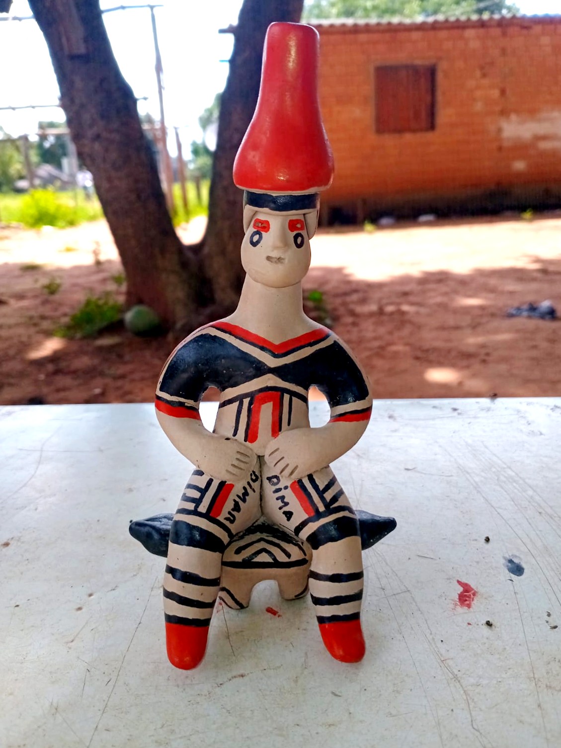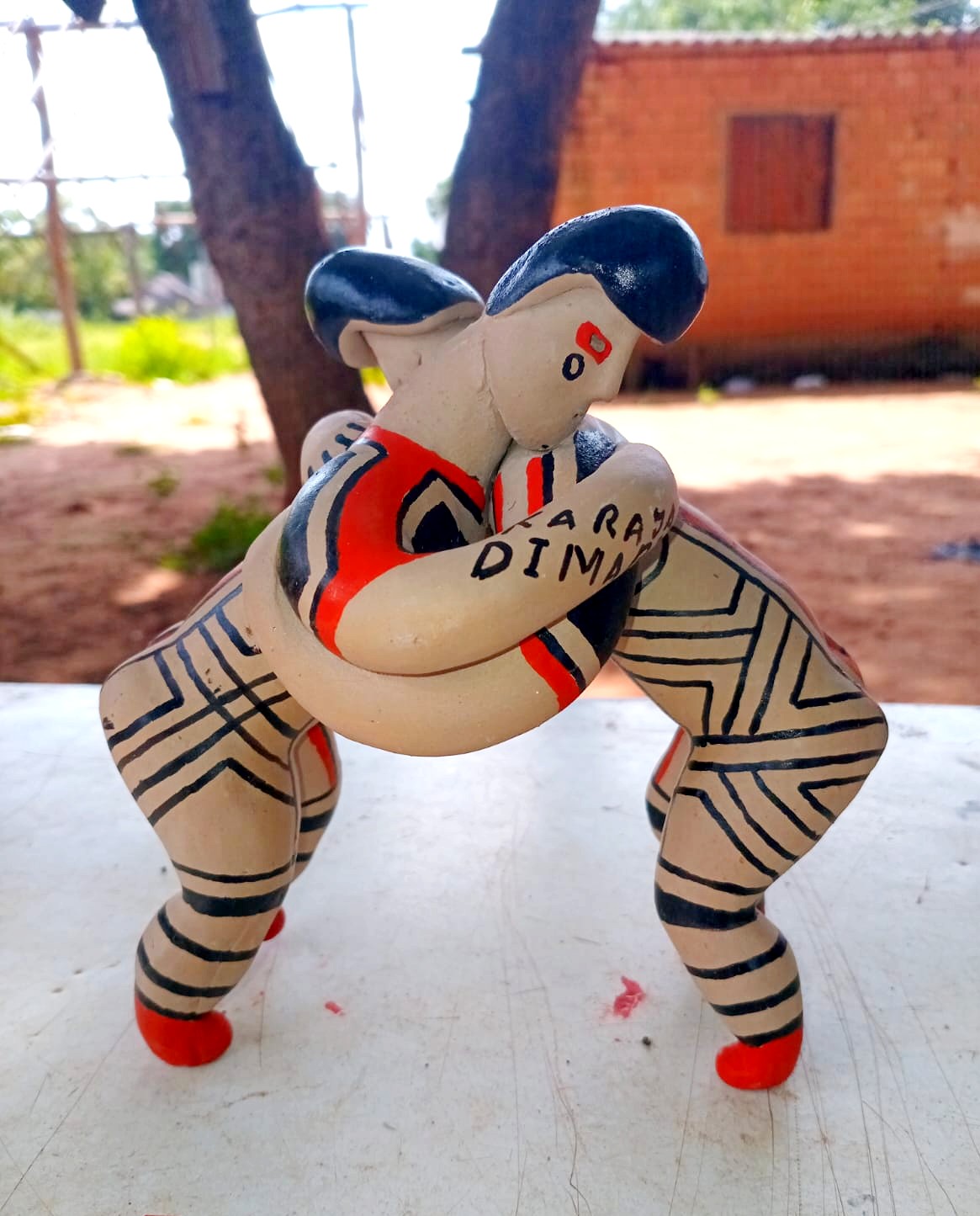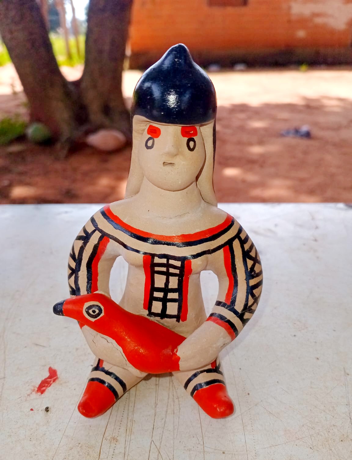 Junto com sua equipe, Taffarel também cria bonecas de cerâmica que guardam histórias milenares. O barro é coletado do outro lado do rio, na divisa com Mato Grosso, onde a terra oferece a mistura perfeita para dar forma aos sonhos e tradições. Cada peça passa pelo fogo sagrado antes de receber as pinturas que contam as histórias de seu povo, num processo que une técnica tradicional e criatividade contemporânea.